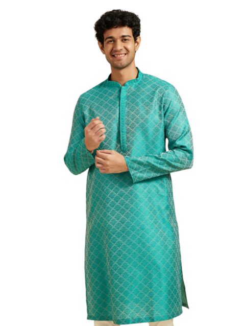 DIWAS BY MANYAVAR Men’s Art Silk Self Design Kurta (Turquoise Blue,L)