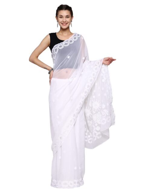 AKHILAM Women’s Black Pure Chiffon Embroidered Saree With Unstitched Blouse (SILVER902I_TFH)