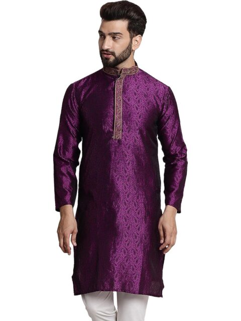 Royal Kurta Men’s Silk Blend Black Color only Long Kurta with Neck Embroidery (40, Purple)