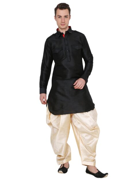 Royal Kurta Men’s Silk Blend Pathani Kurta Salwar Set (42, Black-Gold-)
