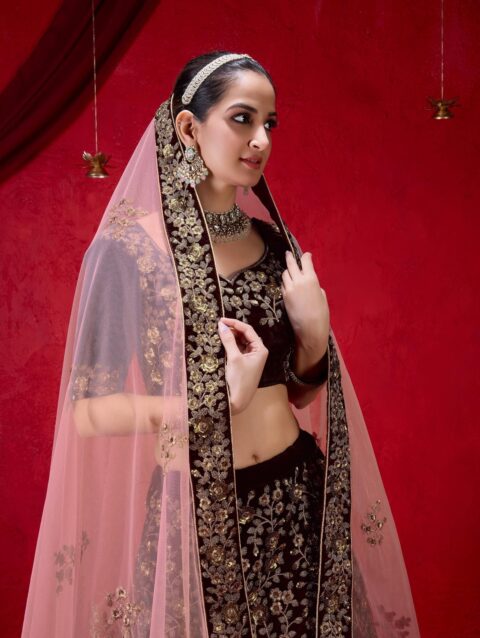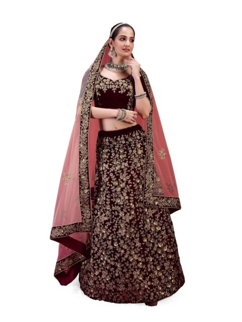 TRENDMALLS Women Velvet Semi Stitched Embroidery Lehenga Choli with Net Dupatta (L253-Maroon-Semi-Stitch), 1.10 Meter