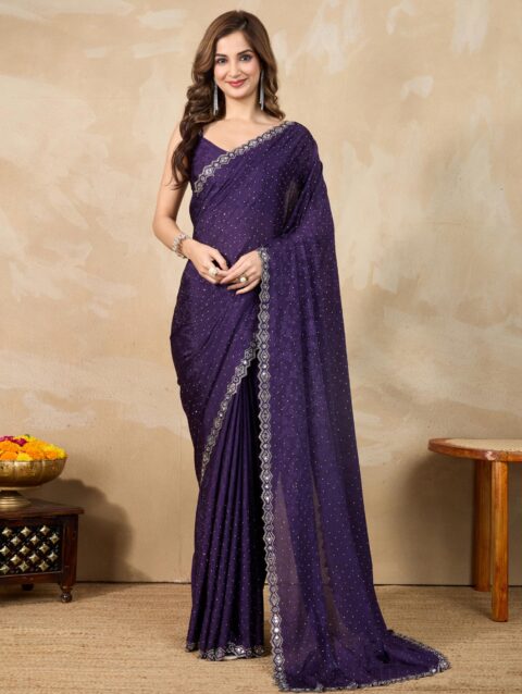 TRENDMALLS Women’s Satin Silk Siroski Zarkan Work Saree with Unstitch Blouse Piece (K1102-Purple)