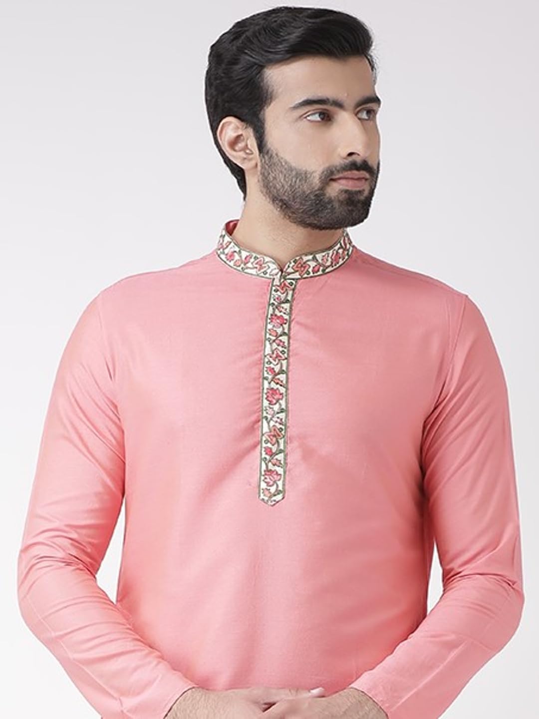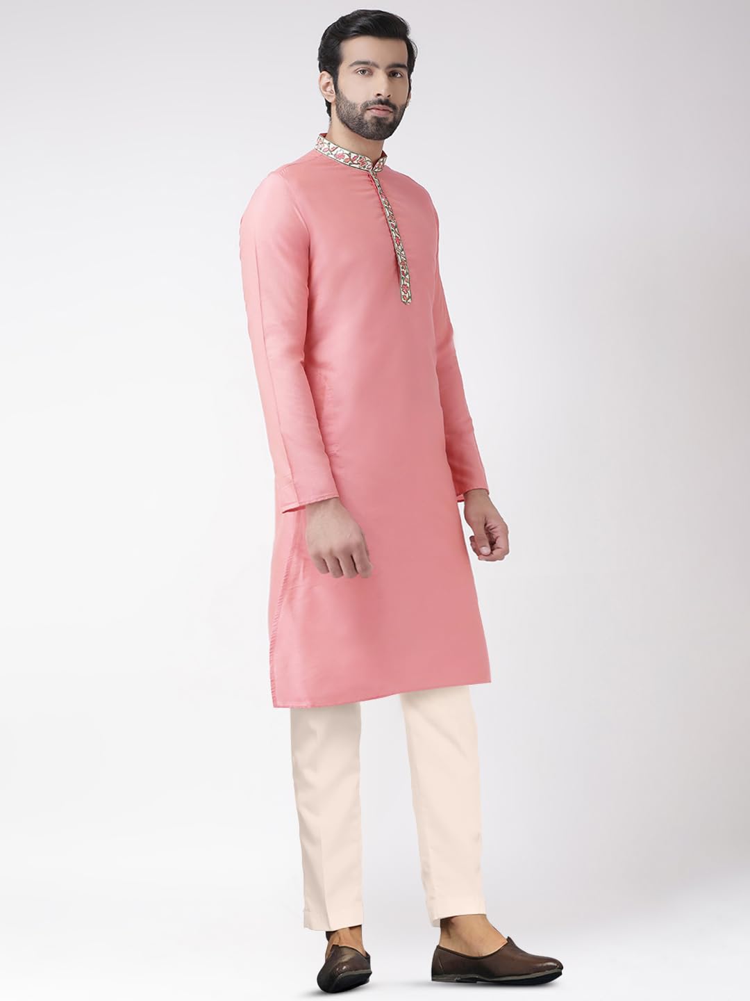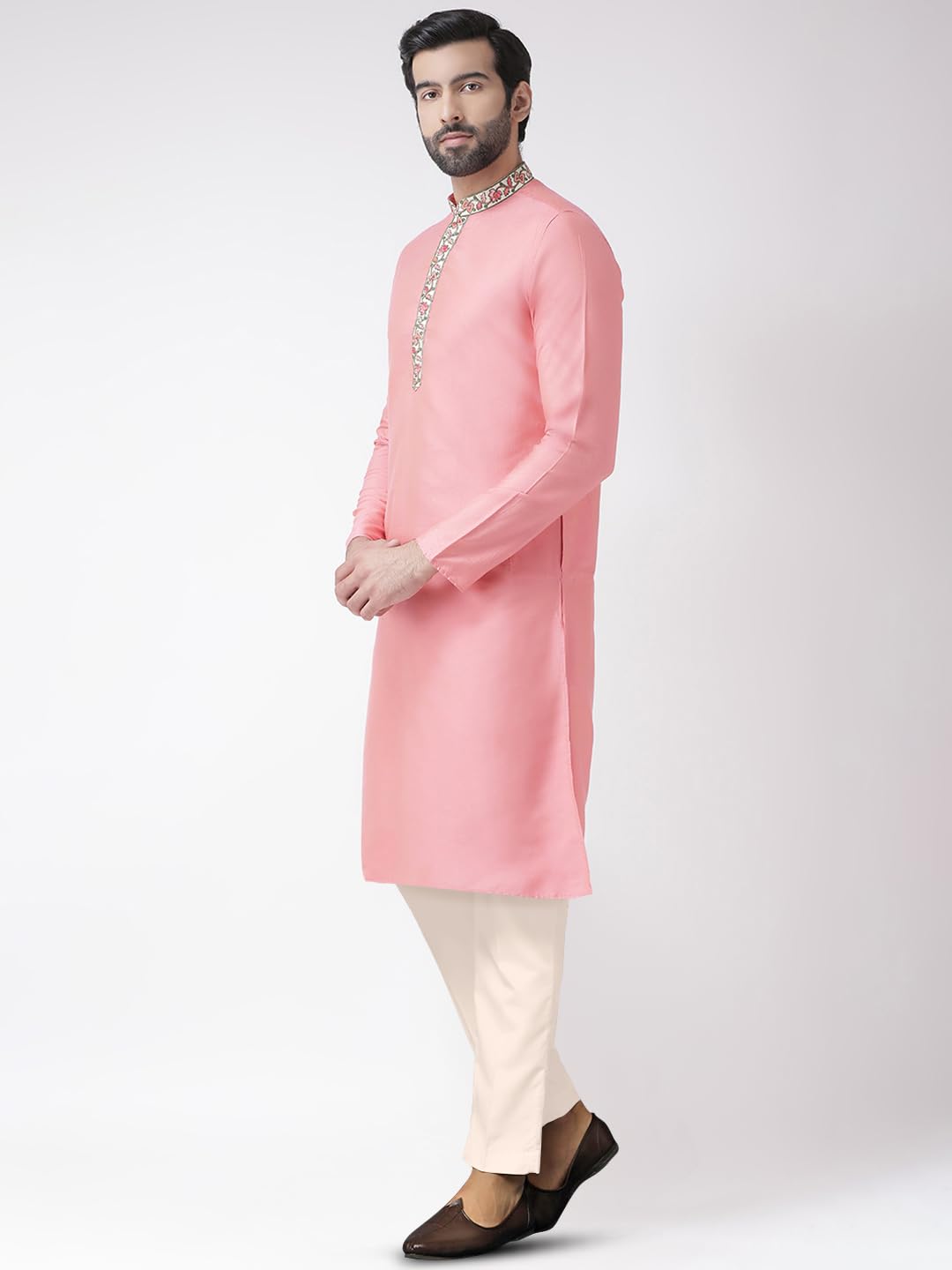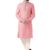 KISAH Men’s Cotton Blend Long Sleeves Regular Fit Solid Pink Kurta Trousers Set (S)