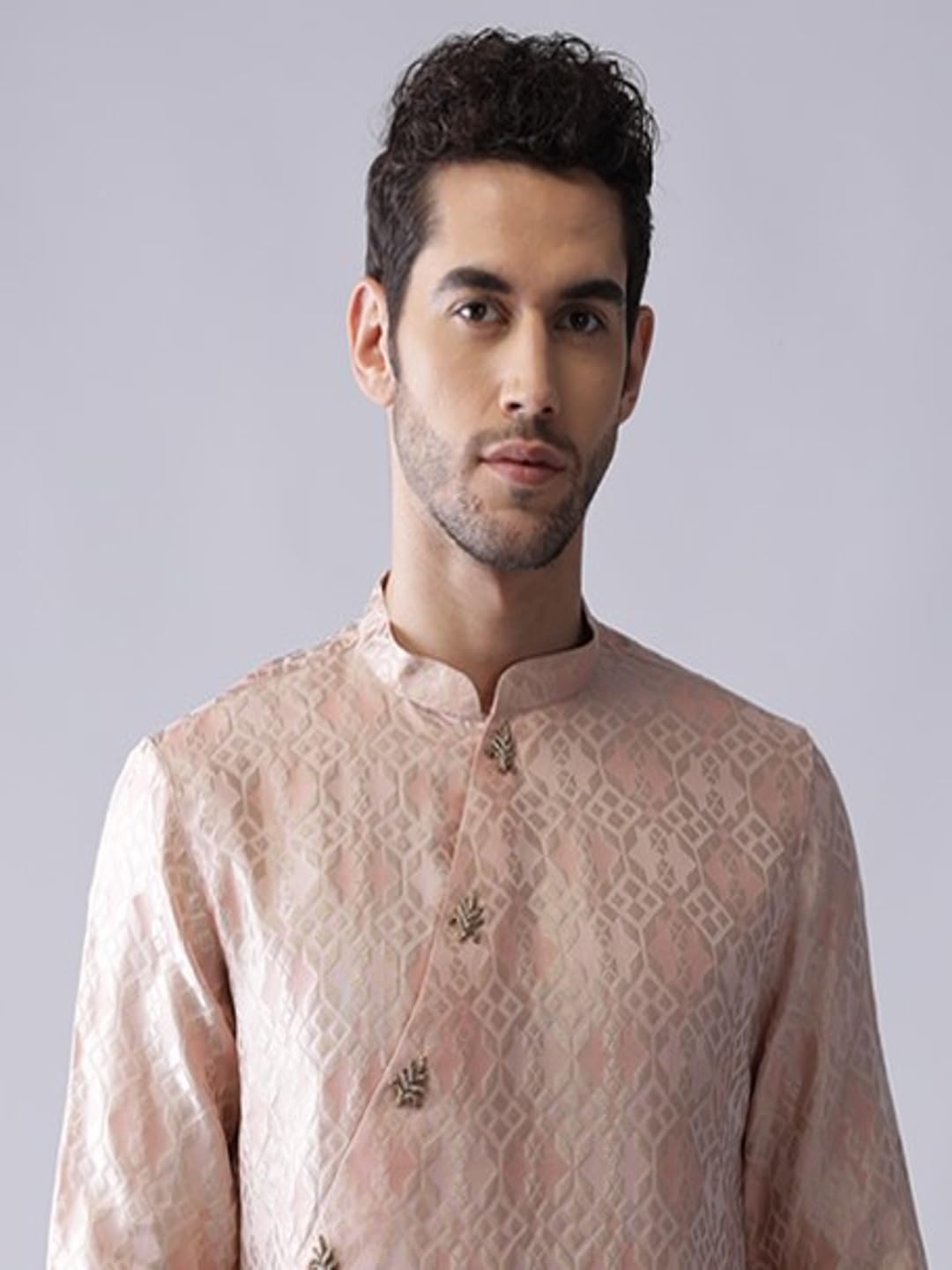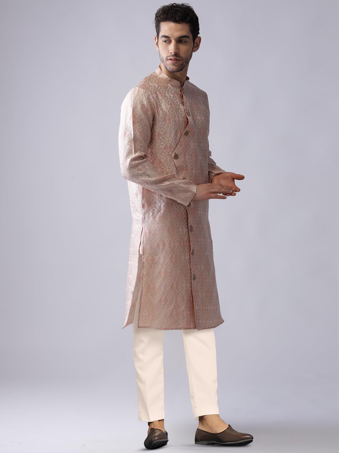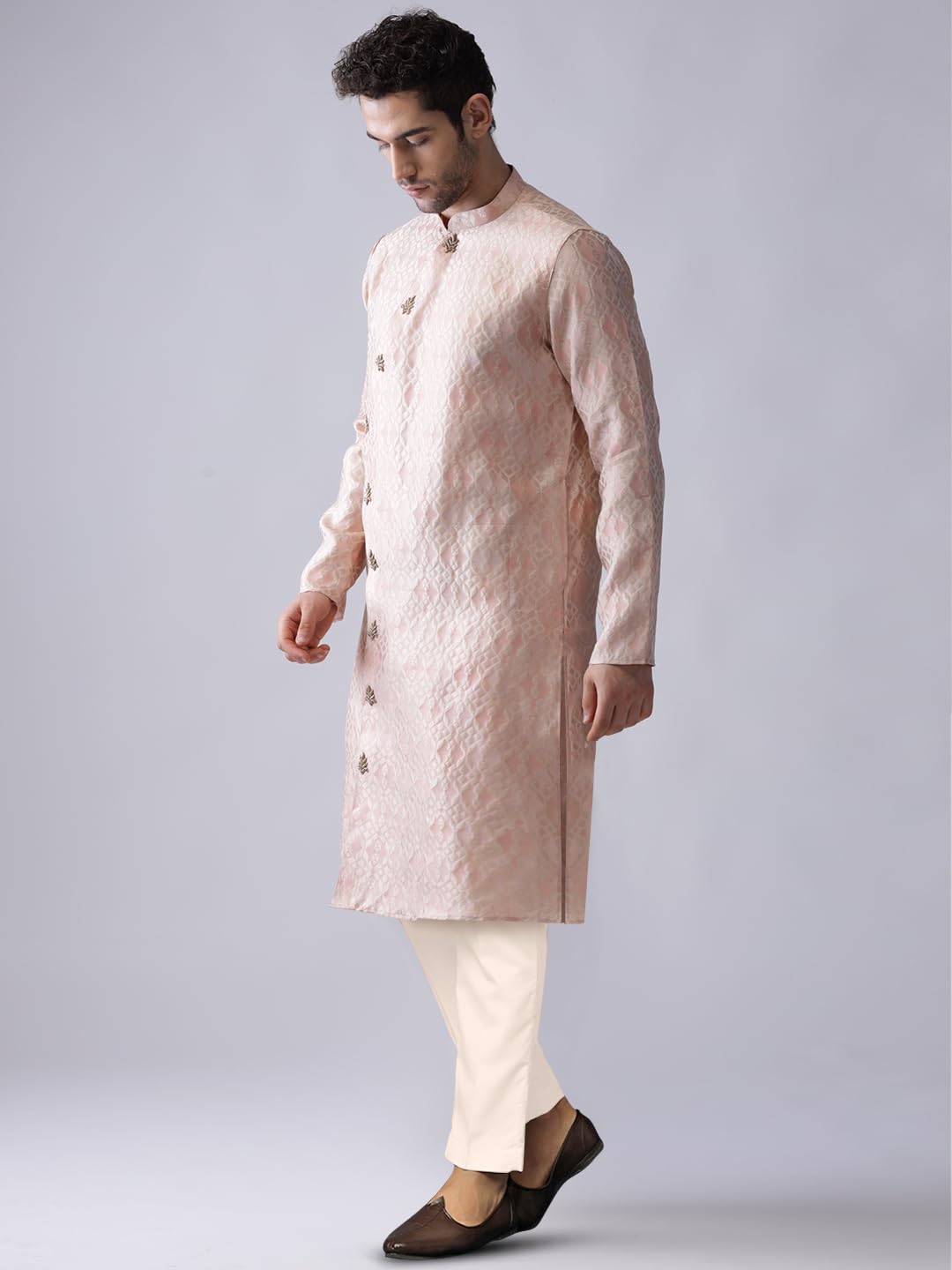 KISAH Men’s Cotton Blend Long Sleeves Regular Fit Woven Design Pink Kurta Trousers Set (M)