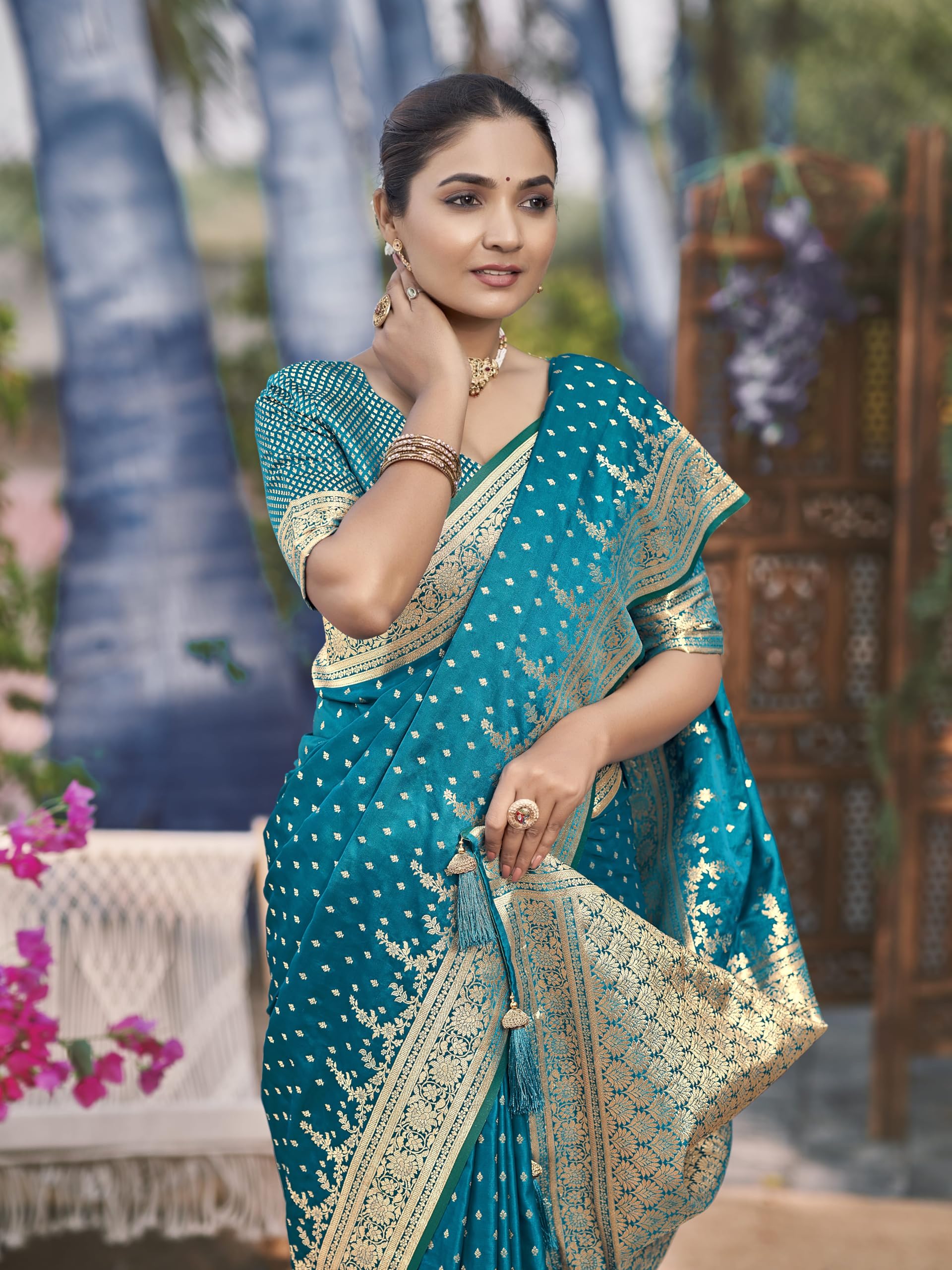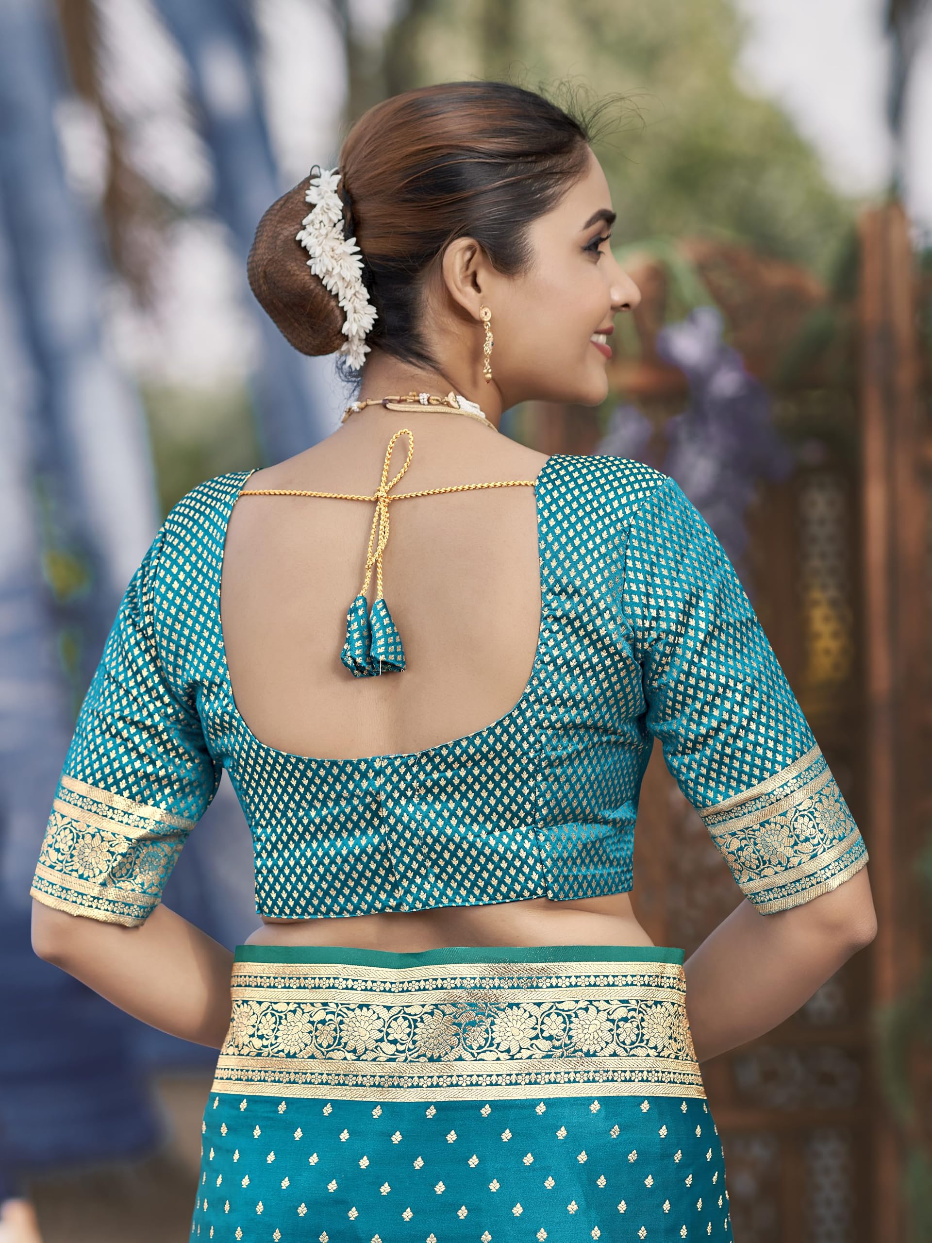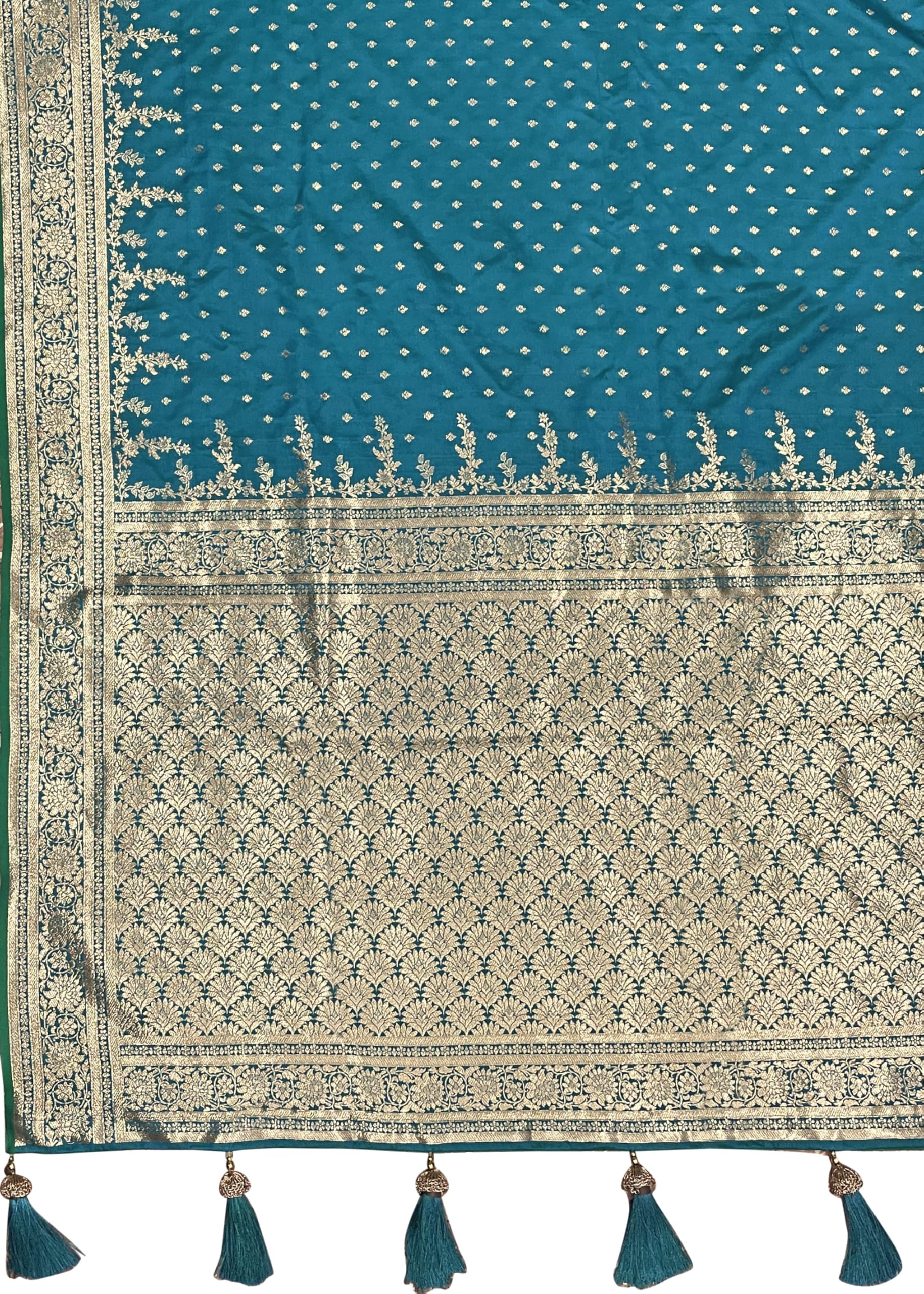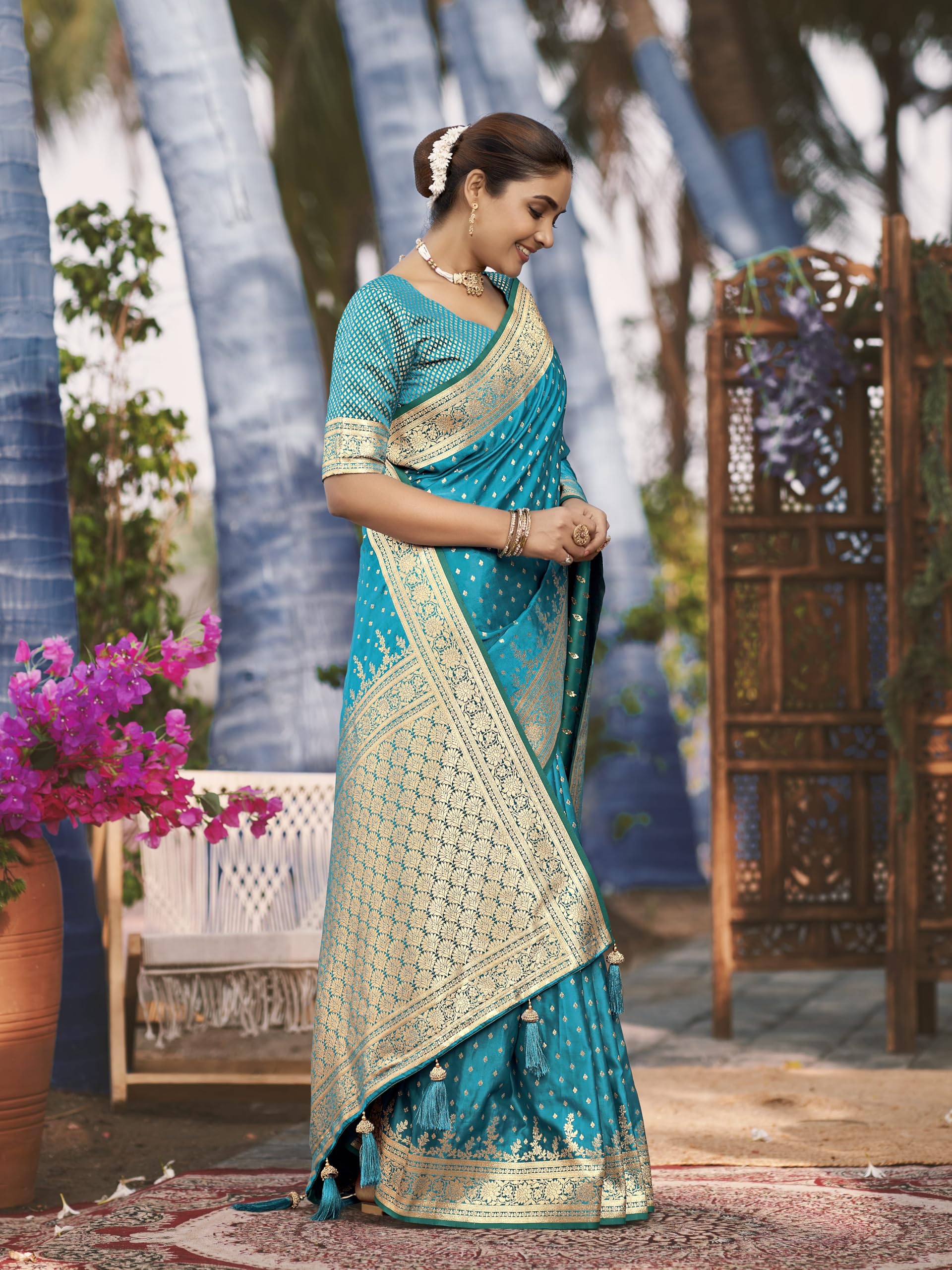 MANOHARI Women’s Most Trendy Banarasi Satin Silk Woven Turquiose Blue Saree With Heavy Jacquard Work Saree With Blouse Piece_MN1993