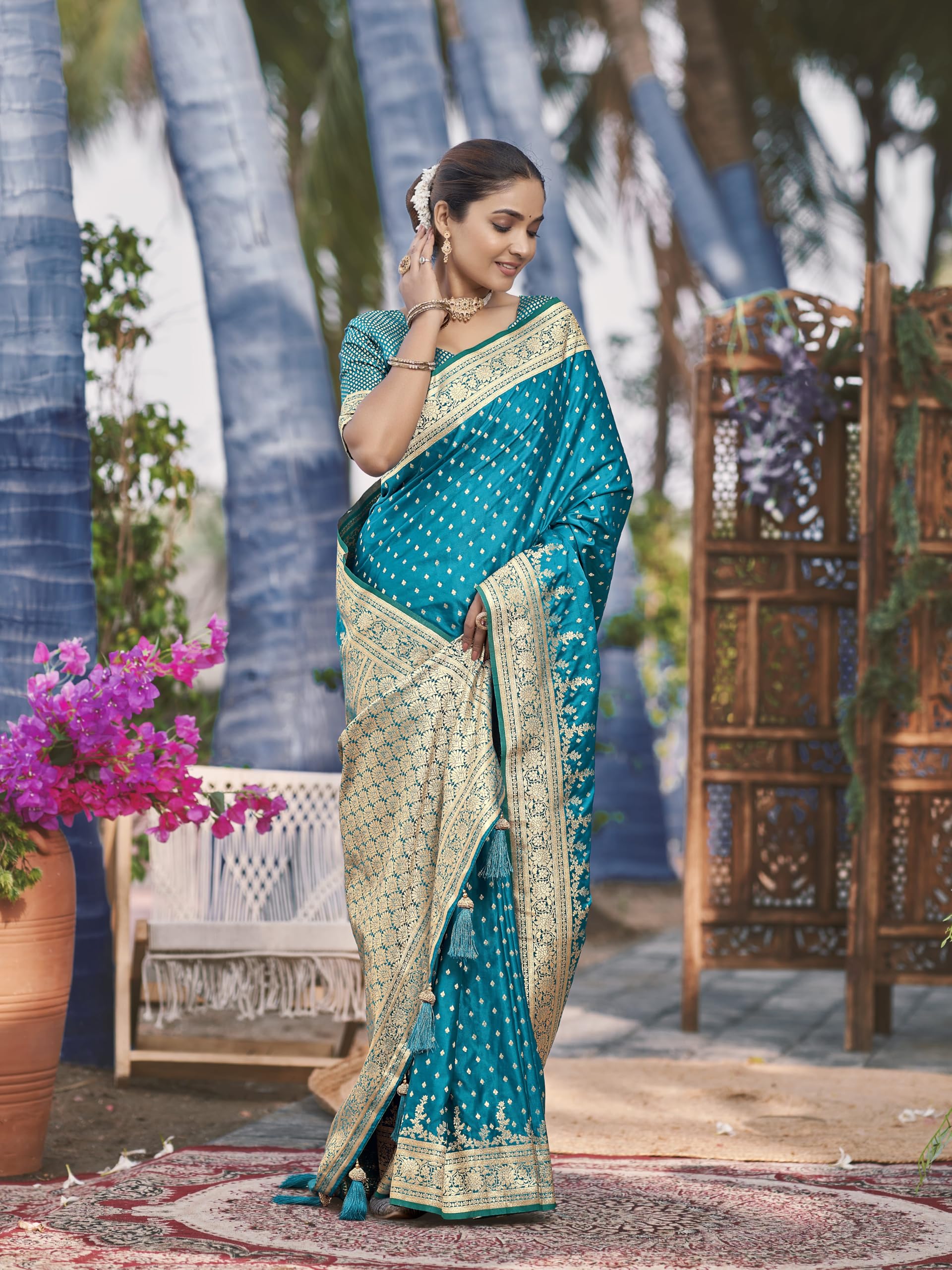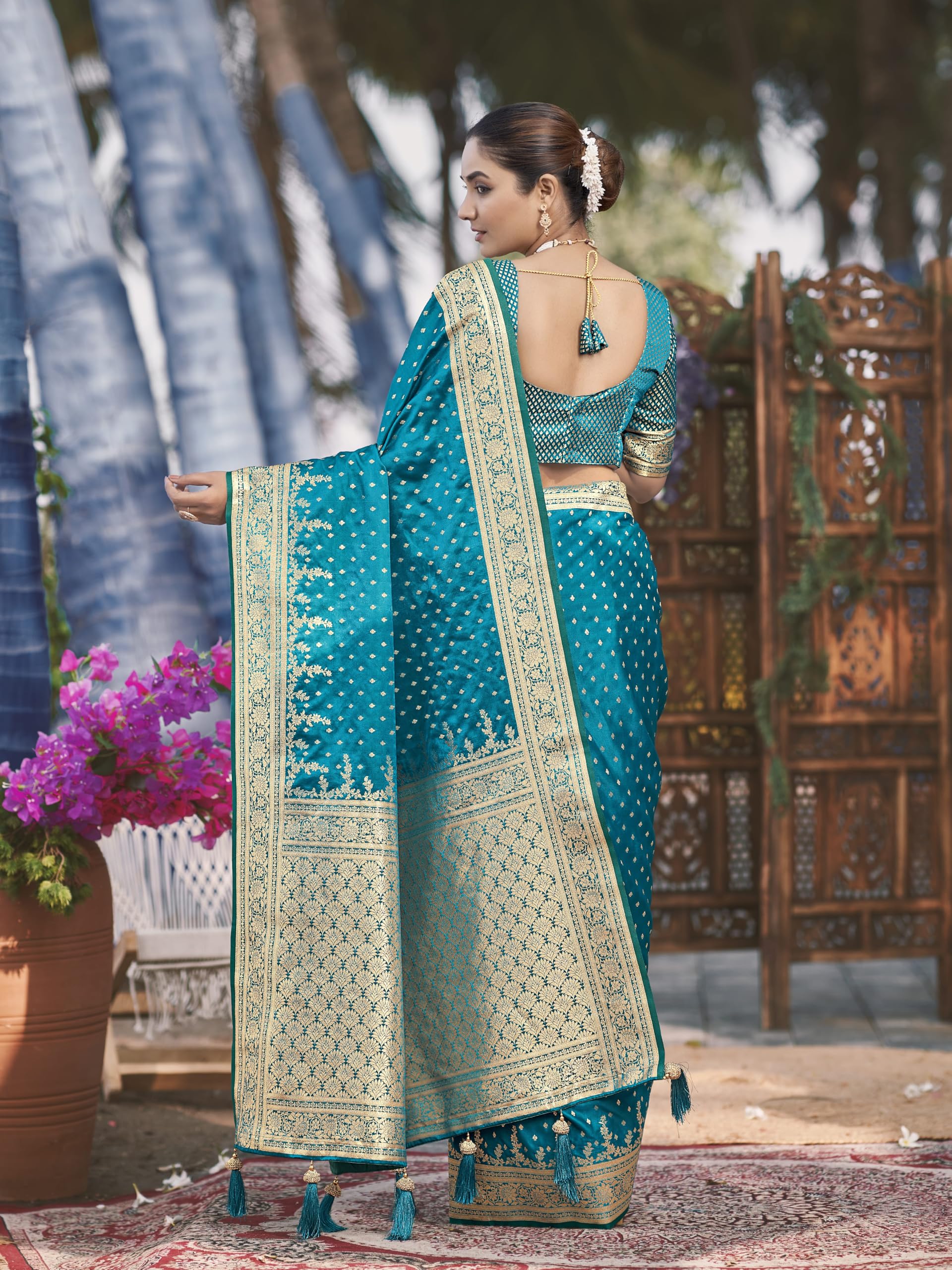 MANOHARI Women's Most Trendy Banarasi Satin Silk Woven Turquiose Blue Saree With Heavy Jacquard Work Saree With Blouse Piece_MN1993