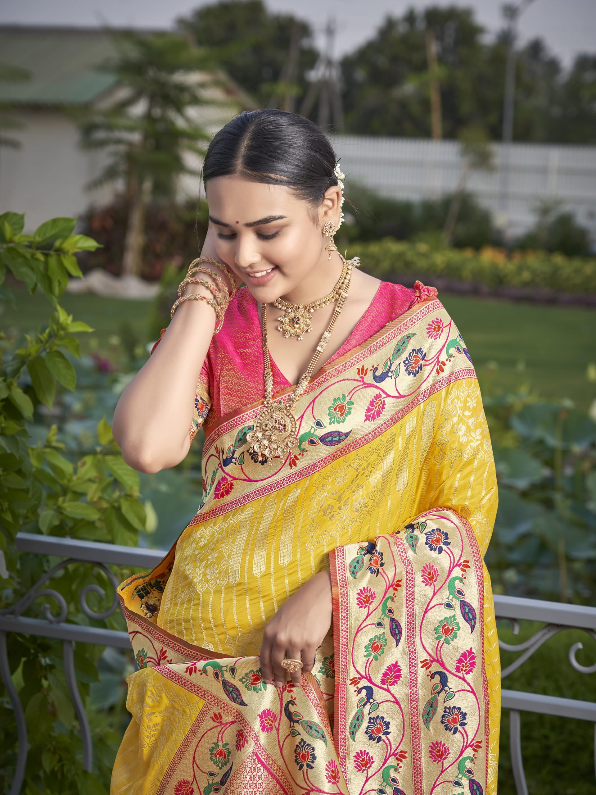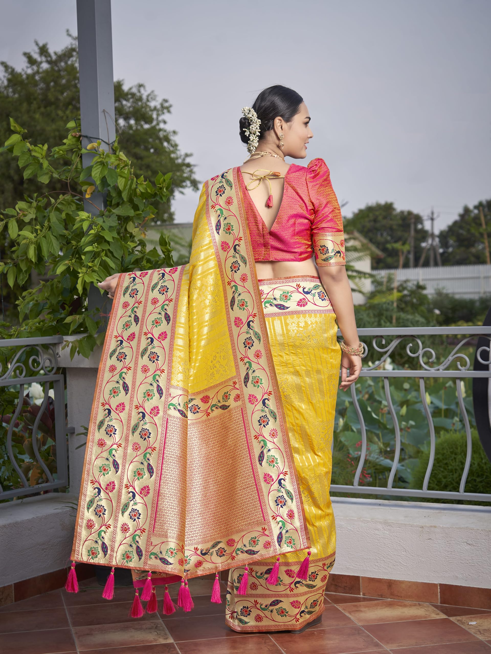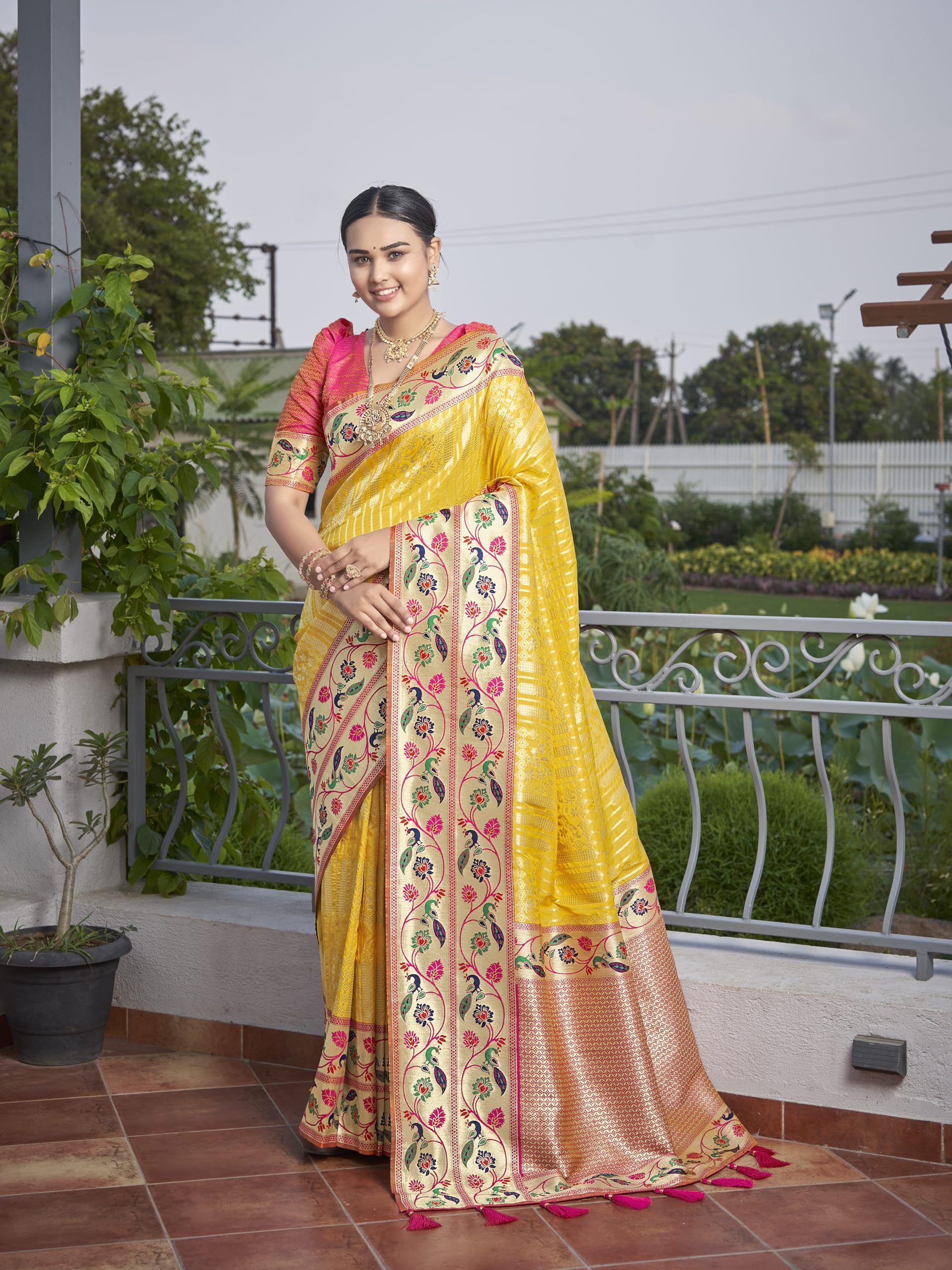 MANOHARI Women’s Most Trendy Banarasi Woven Yellow with Pink Saree With Heavy Jacquard Work Saree With Blouse Piece (Yellow)