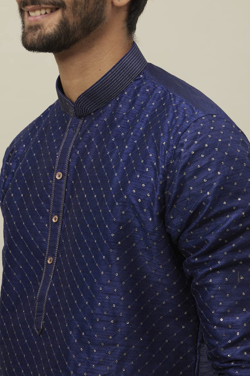 - Design: This midnight sapphire blue kurta set elegantly combines a self pattern with sequin work, creating a sophisticated and shimmering effect. The metallic thread work placket and bandhgala collar with wooden buttons add a refined touch. Ideal for evening events or celebrations, style this kurta with polished shoes. Accessorize with a silver watch to enhance its luxurious appeal.