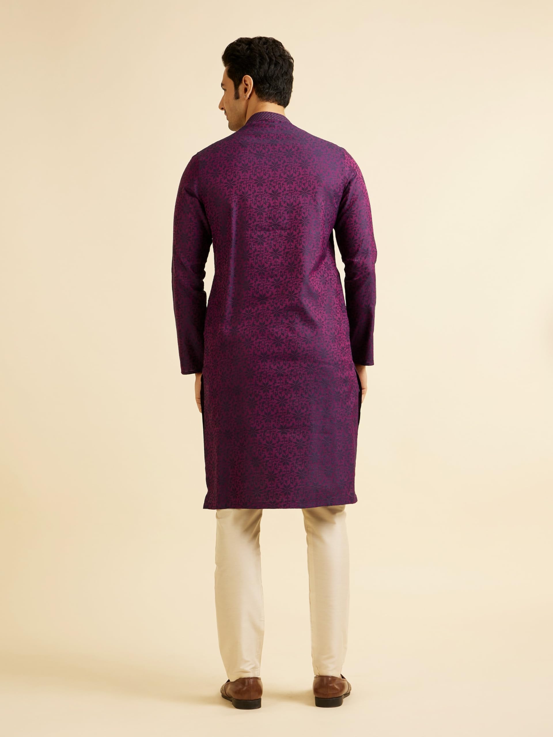 - Design:- Embrace sophistication with our Purple Floral Jaal Patterned Kurta Set for men. This elegant ensemble features intricate floral jaal motifs on rich purple fabric, offering a perfect blend of traditional charm and modern style. Ideal for festive occasions and weddings, the kurta set exudes timeless grace and refined taste. Pair it with beige or gold churidar and traditional mojari shoes to complete the look and make a striking impression.