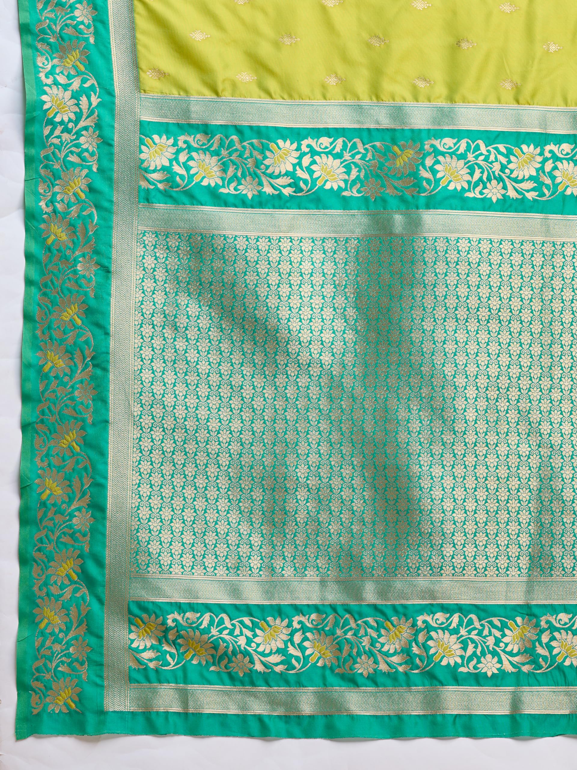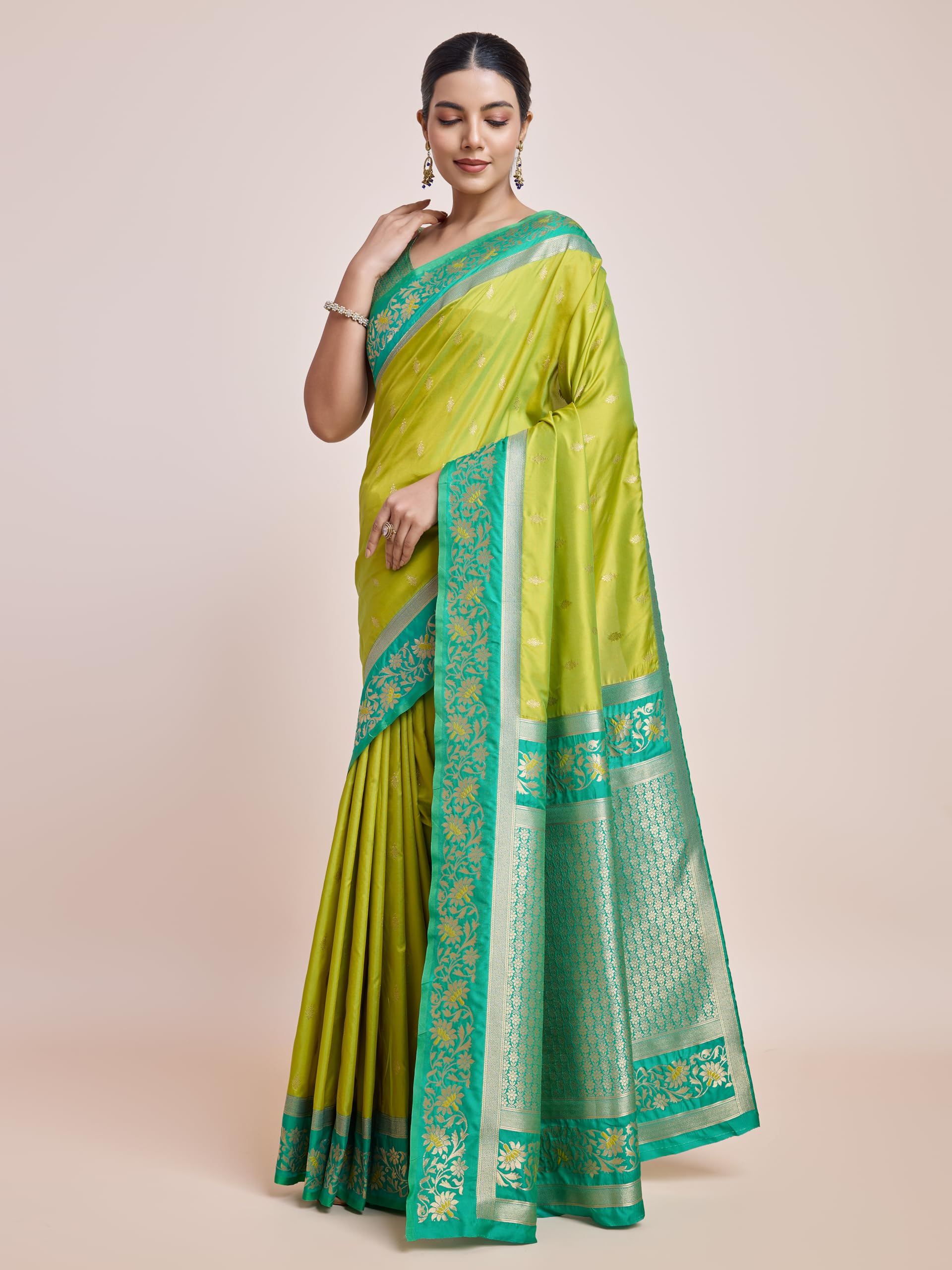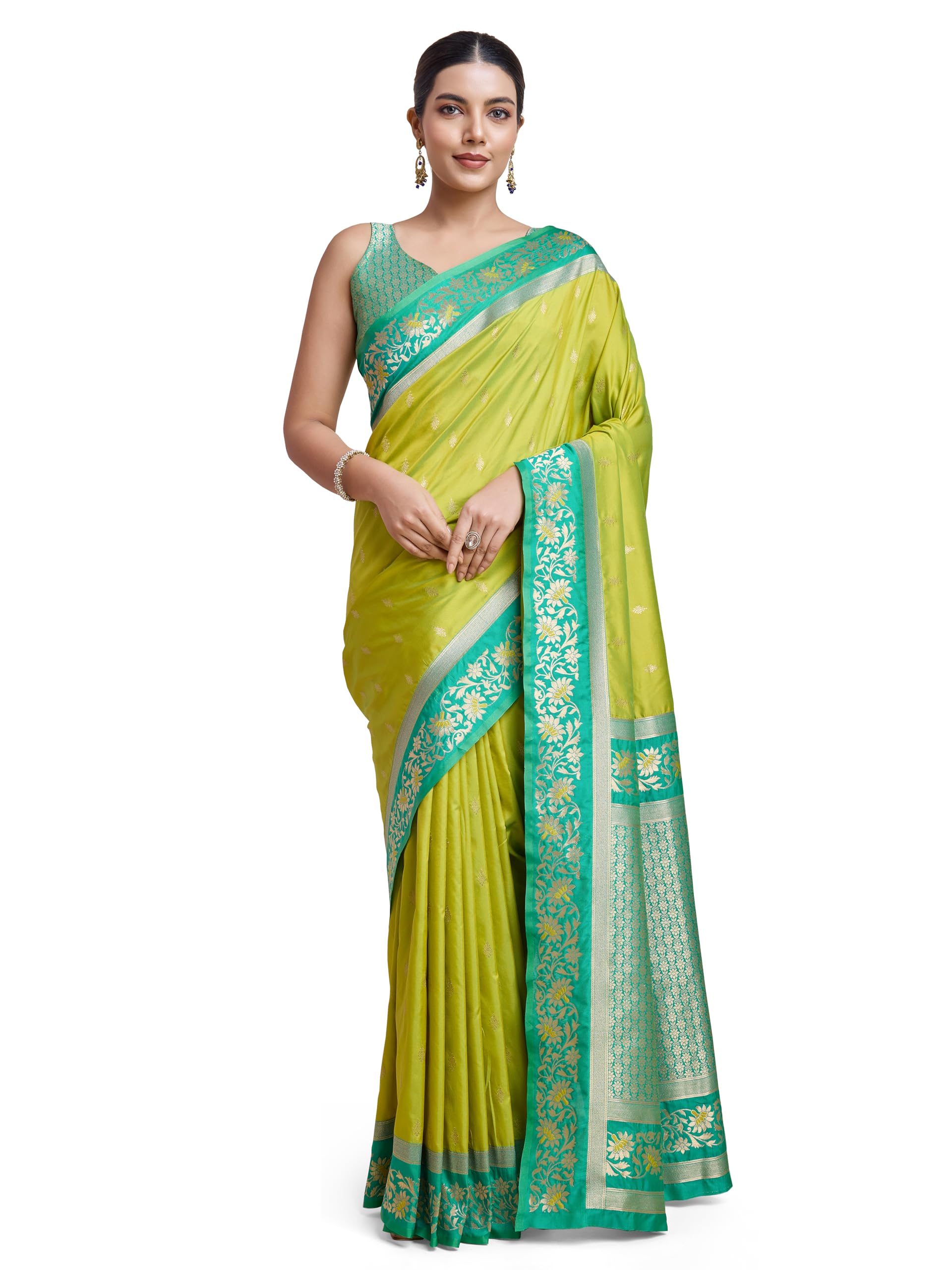 Monjolika Fashion Women’s Banarasi Silk Saree in Satin and traditional golden zari work comes with Unstitched Blouse Piece (Parrot Green)