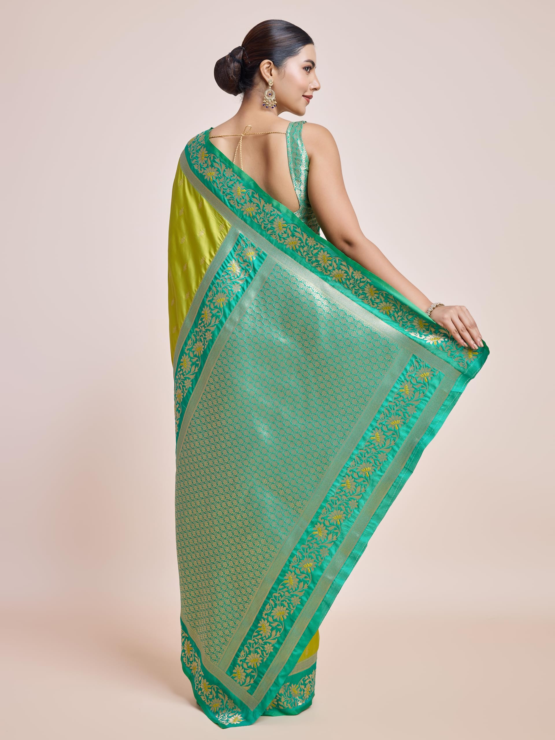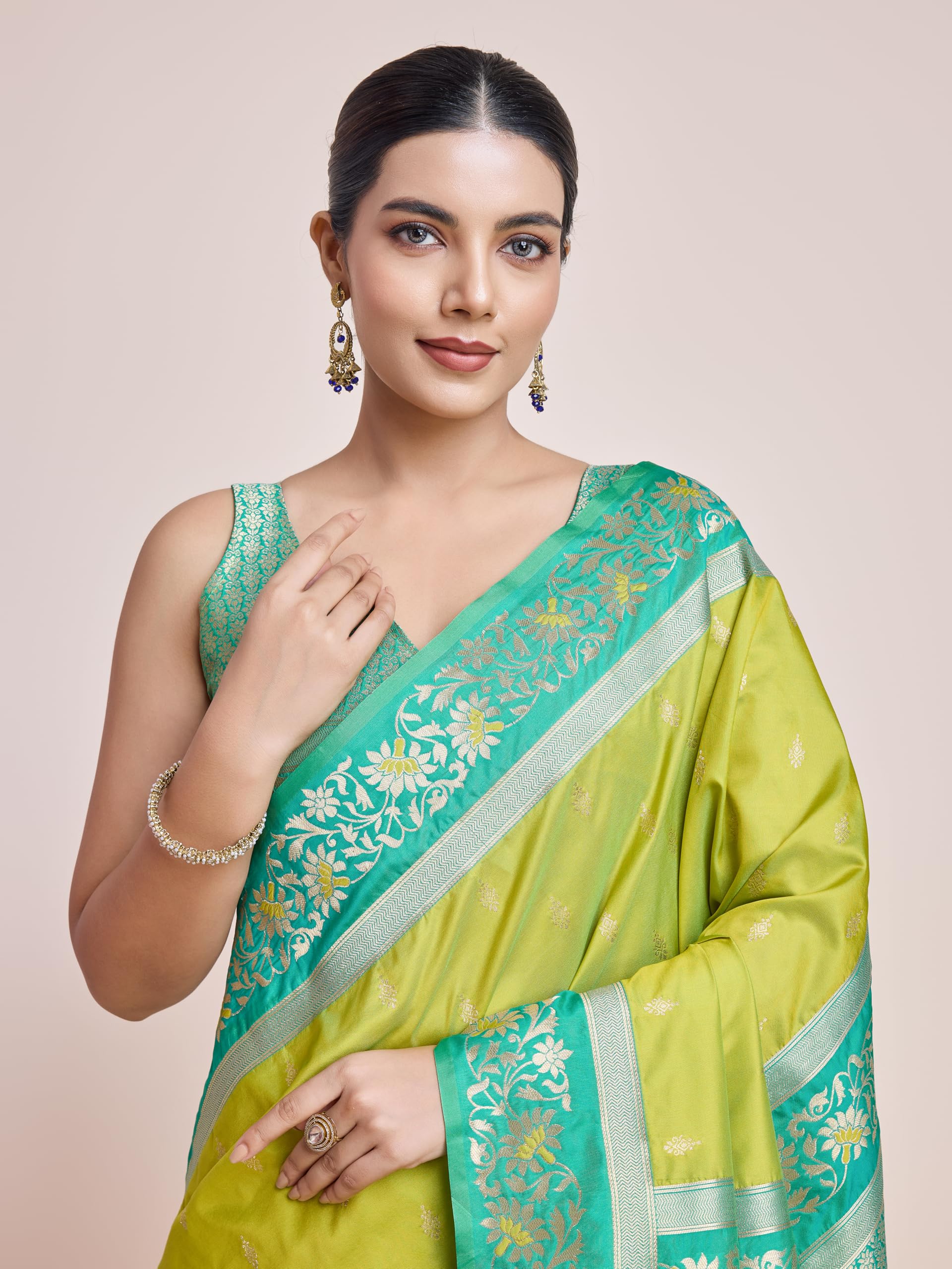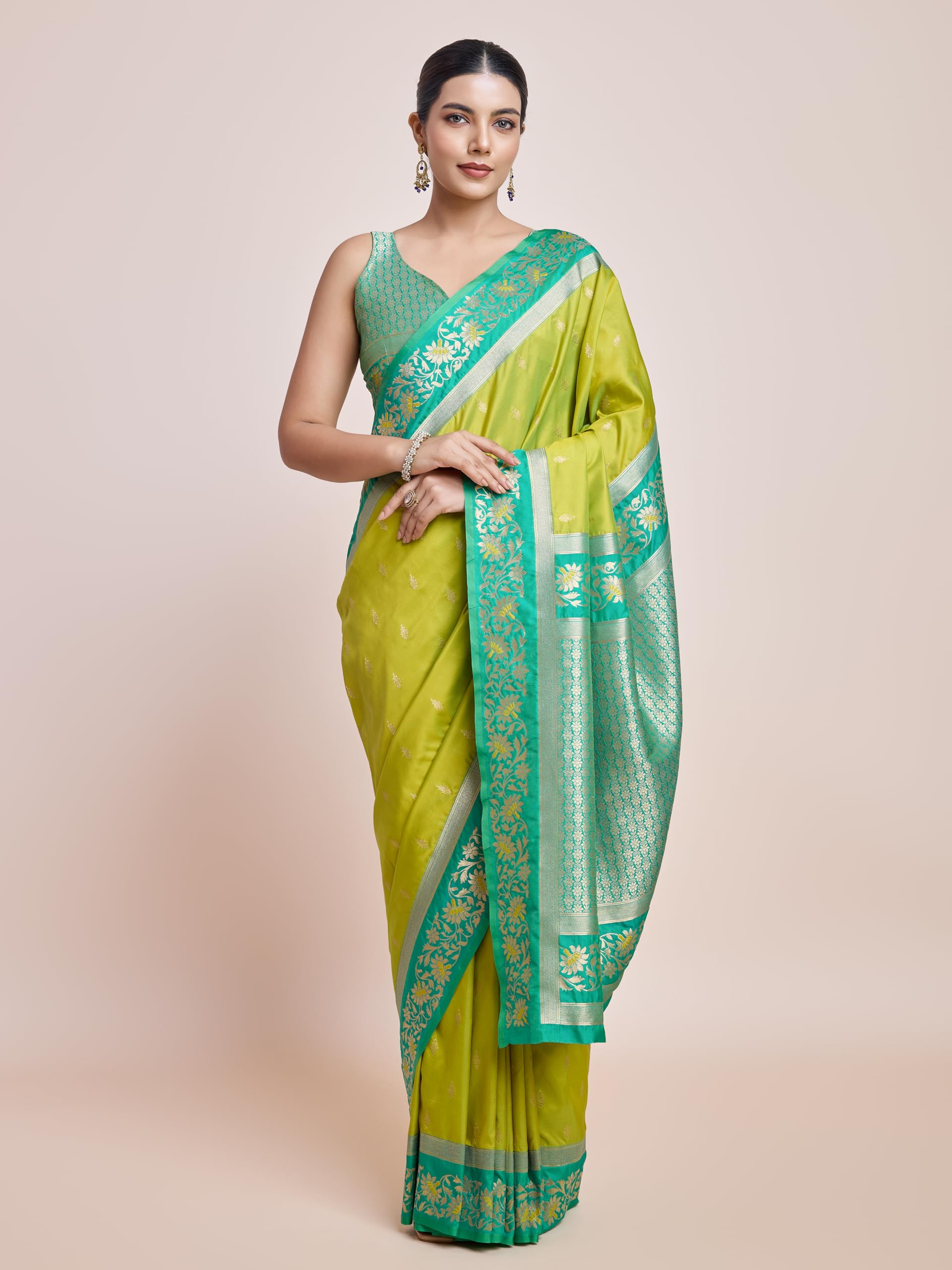• Product Highlights : Fabric: Banarasi Satin Silk (Saree & Blouse) || Work: Zari Woven Work (Saree), Zari Woven (Blouse) || Colour: Saree –Parrot Green | Blouse – Green || Lightweight yet traditional banarasi saree for your perfect occasion look.