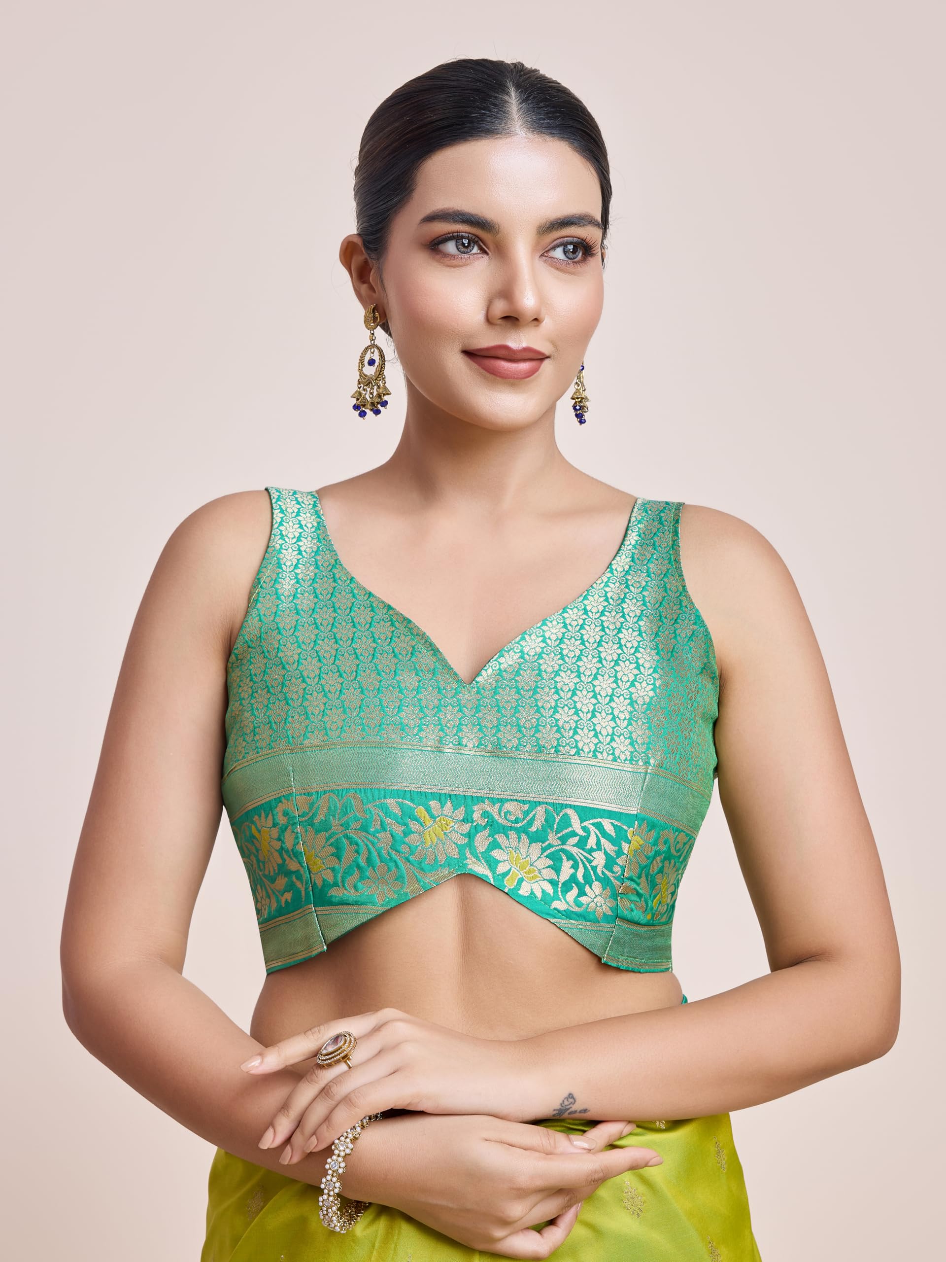 • Styling Tip: Accessorize with layered necklaces, statement earrings, and a potli bag in complementary tones.Style your hair in waves or a soft bun and opt for glowing, gold-toned makeup.