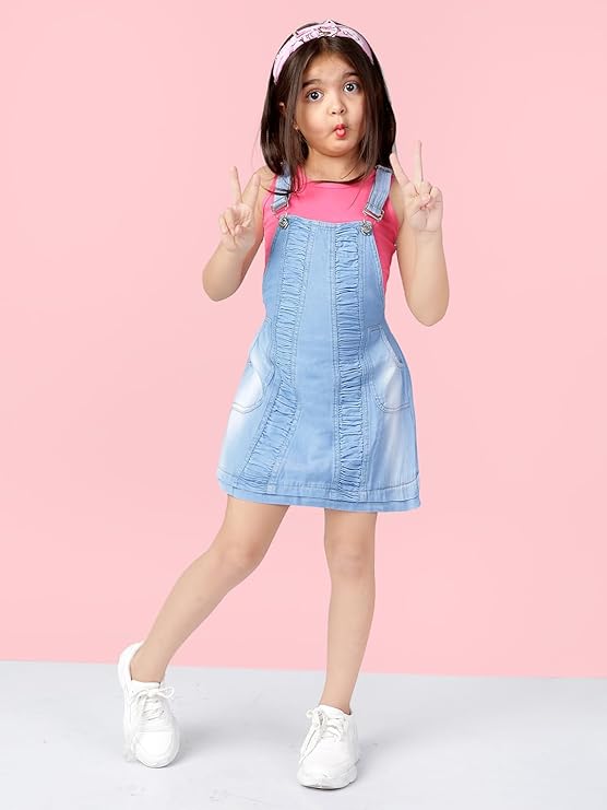 Naughty Ninos Girls Blue Solid Pinafore Denim Dress with T-Shirt for 2 to 12 Years
