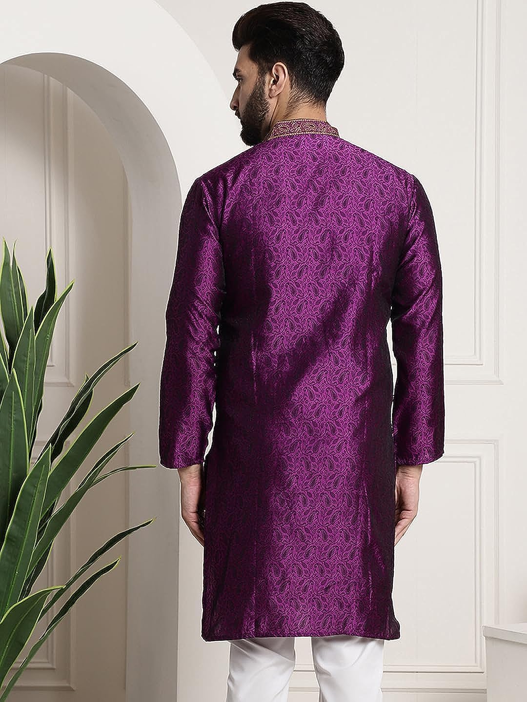 Royal Kurta Men’s Silk Blend Black Color only Long Kurta with Neck Embroidery (40, Purple)