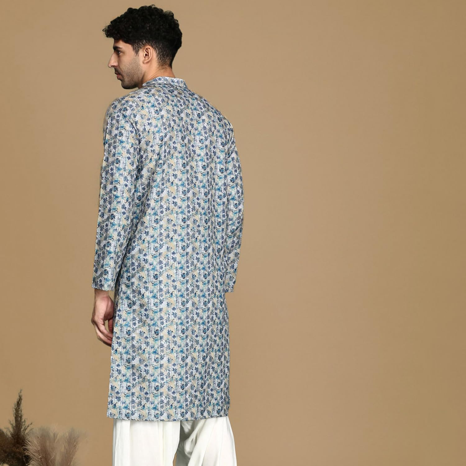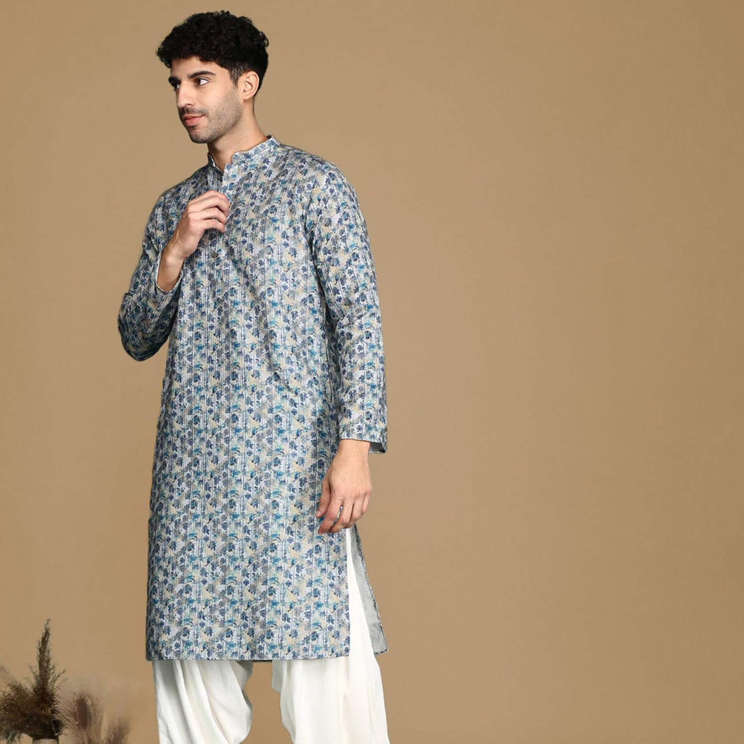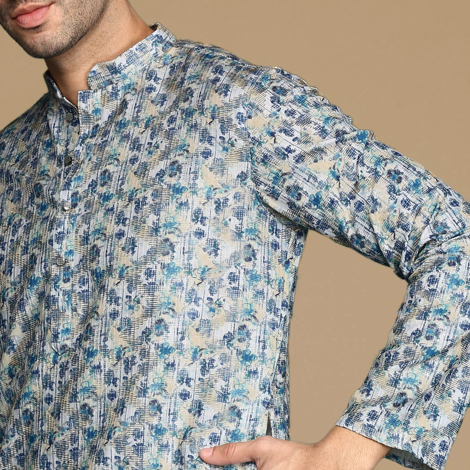 - The Kurta Set showcases meticulously printed work, adding depth and charisma to your look. The mandarin collar elevates the Kurta Set’s appeal, infusing it with a touch of regal elegance. The straight hem with side slits not only enhances movement but also creates a stylish and dynamic silhouette.