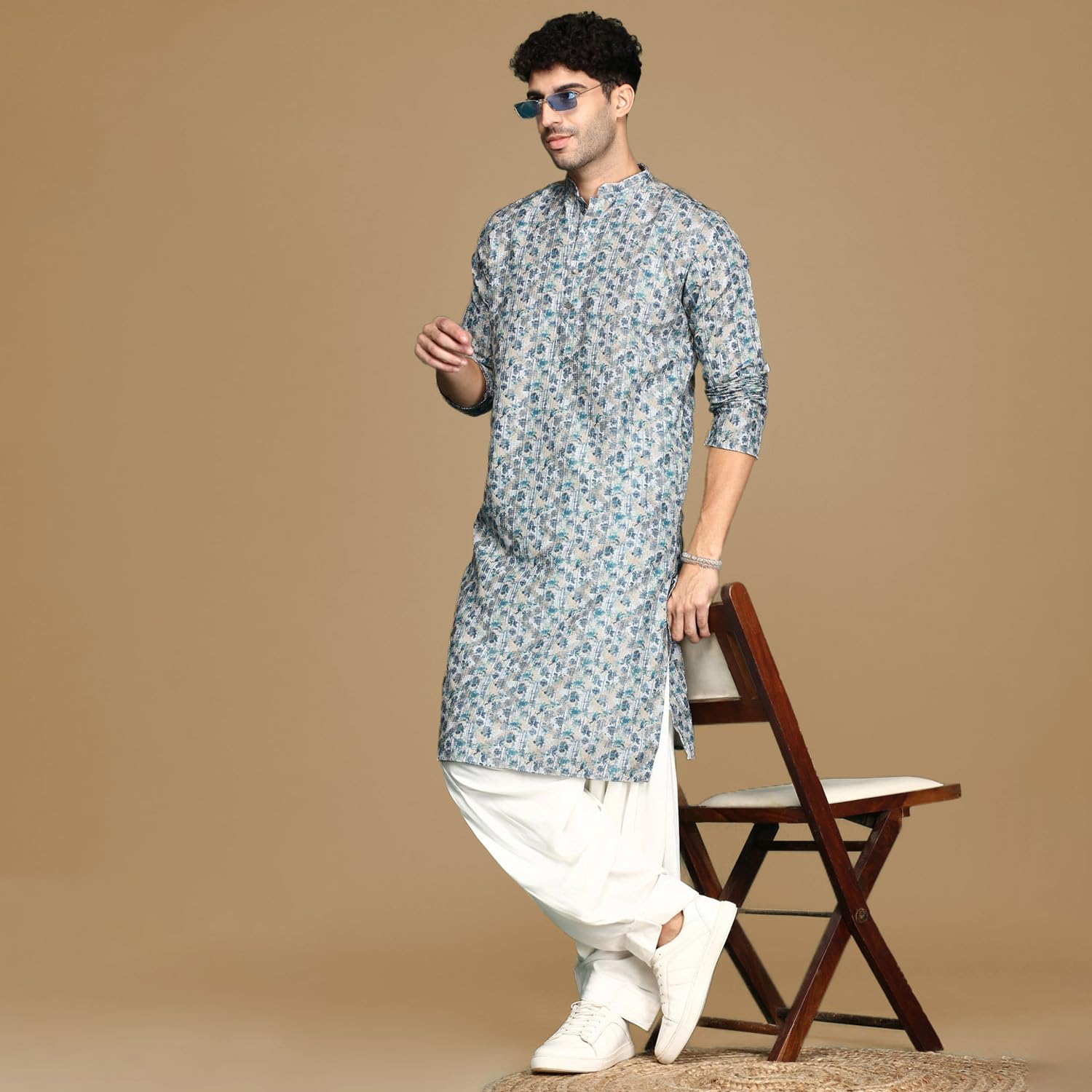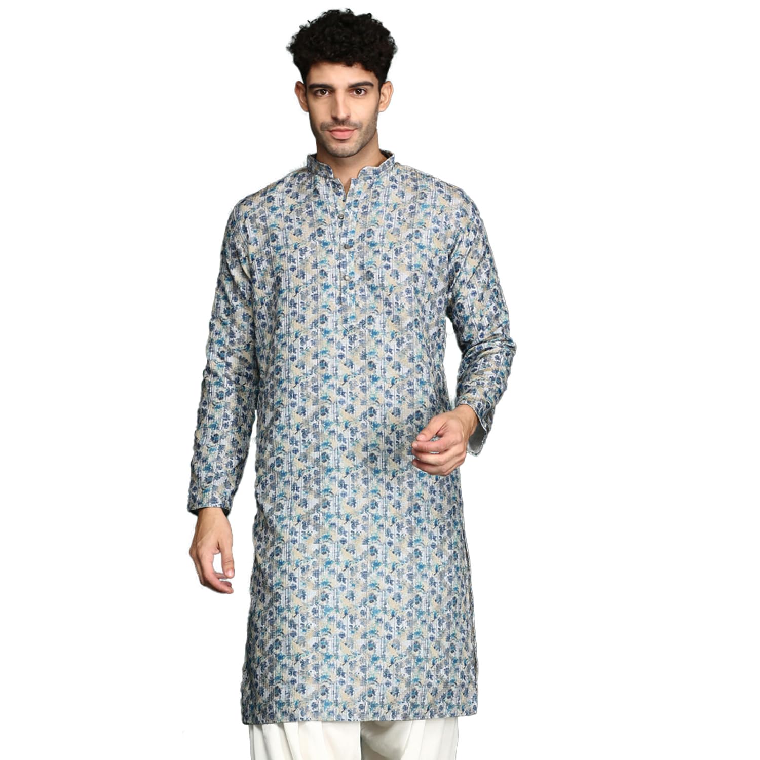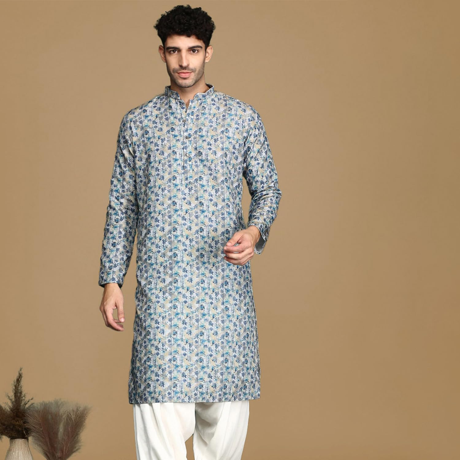 - The Kurta Set showcases meticulously printed work, adding depth and charisma to your look. The mandarin collar elevates the Kurta Set’s appeal, infusing it with a touch of regal elegance. The straight hem with side slits not only enhances movement but also creates a stylish and dynamic silhouette.