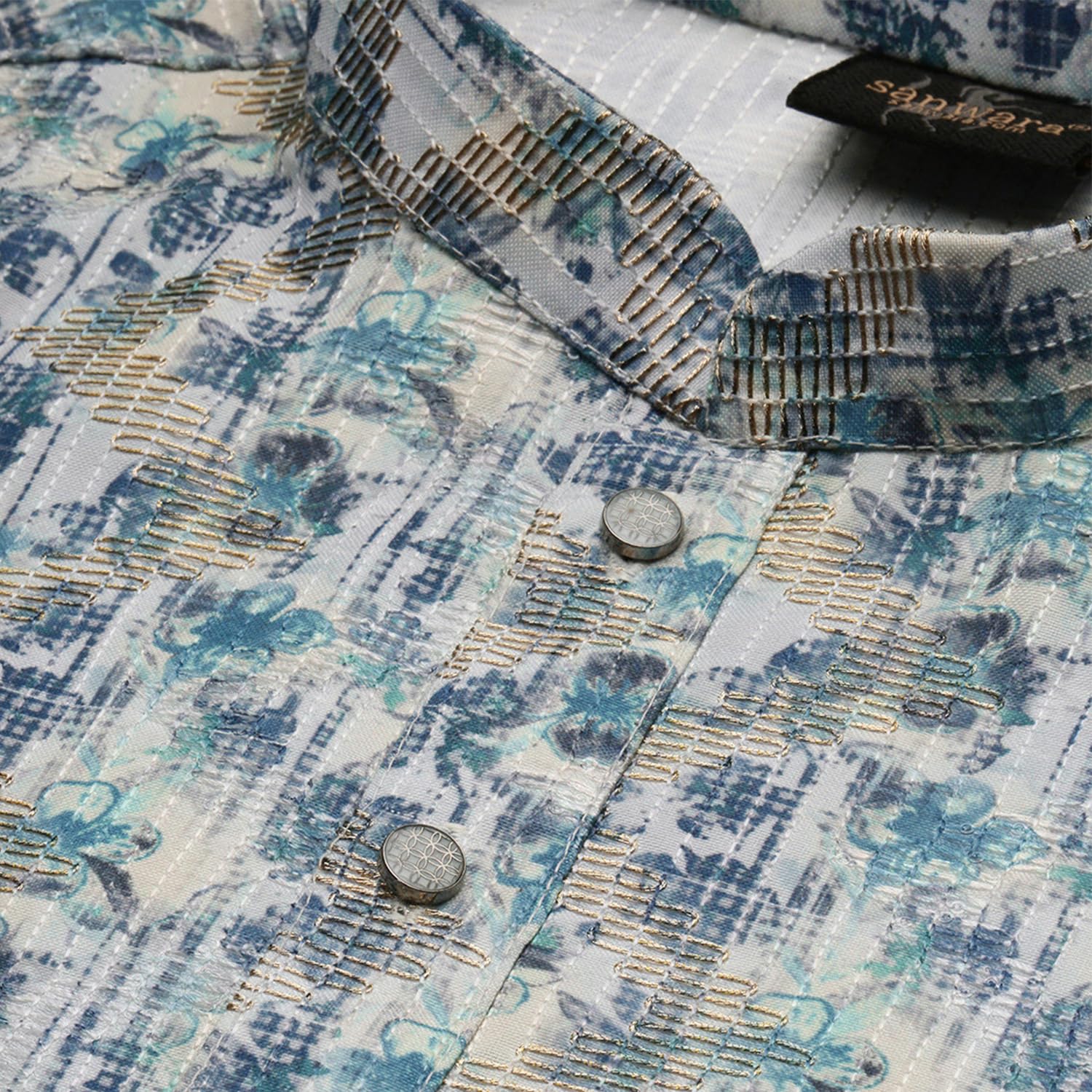 Sanwara Dapper & Dazzling Men’s Printed Sky Blue Golden Zari Touch Up Trendy Wear Cotton Kurta (36)