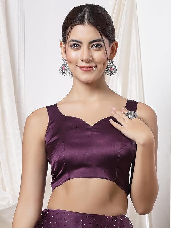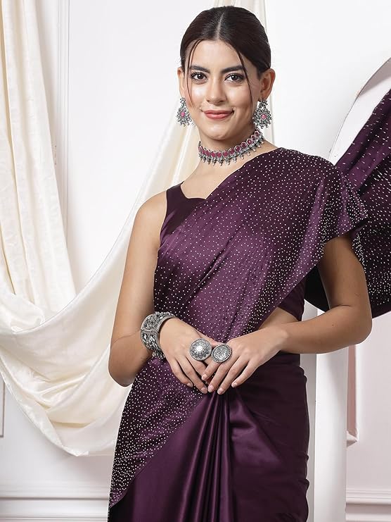 SIRIL Women’s Satin Silk Hot Fixing Stone Work Saree with Unstitched Blouse