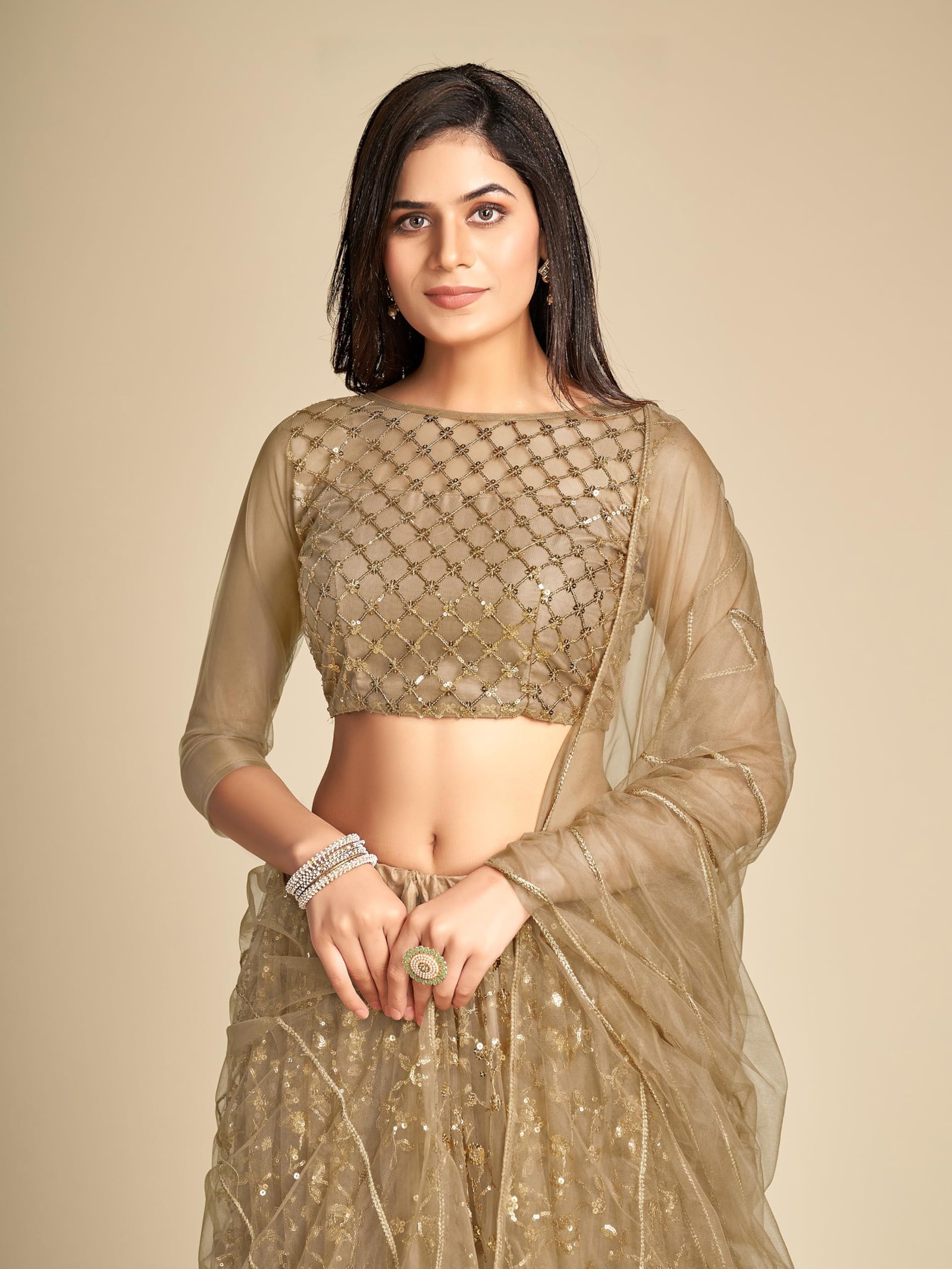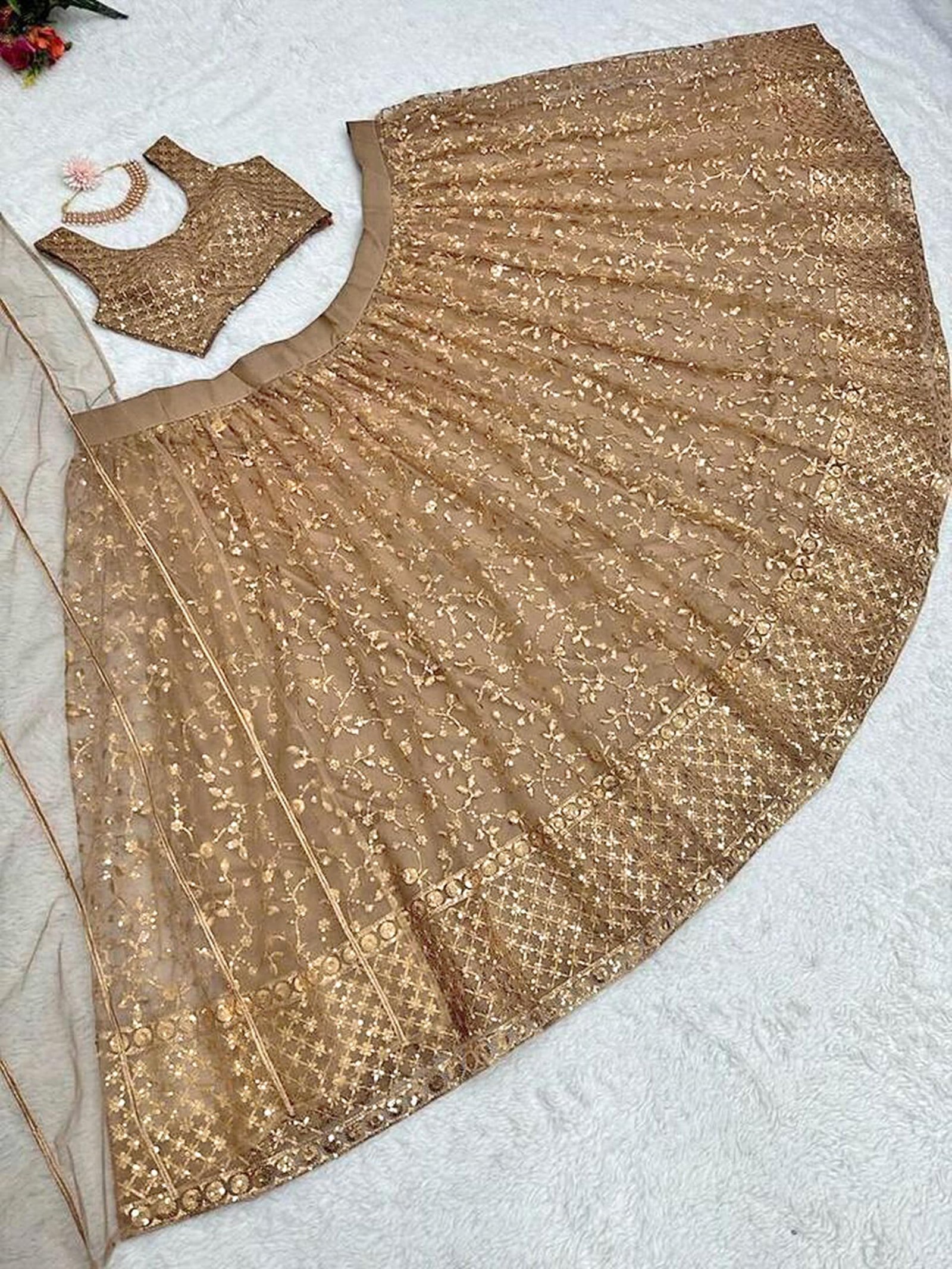 TRENDMALLS Women's Net Embroidery Lehenga Choli With Net Dupatta (L144-Gold, Semi stitched)