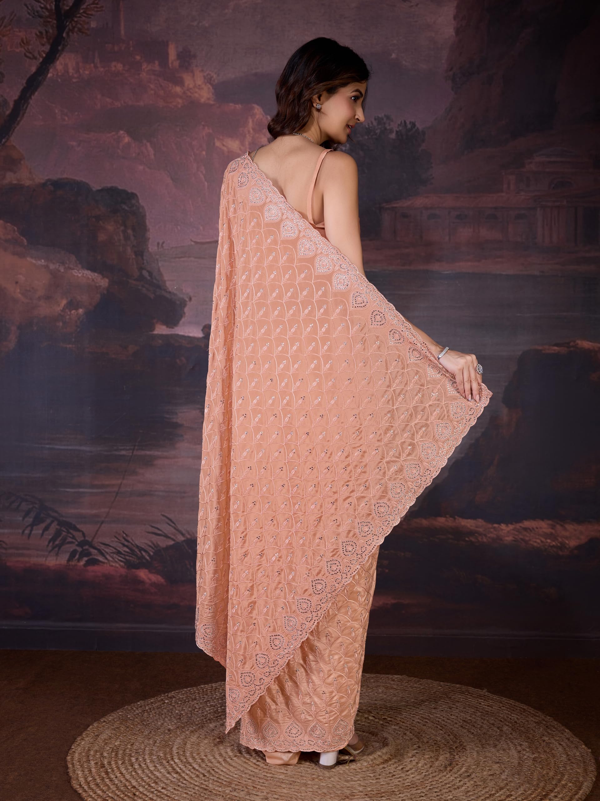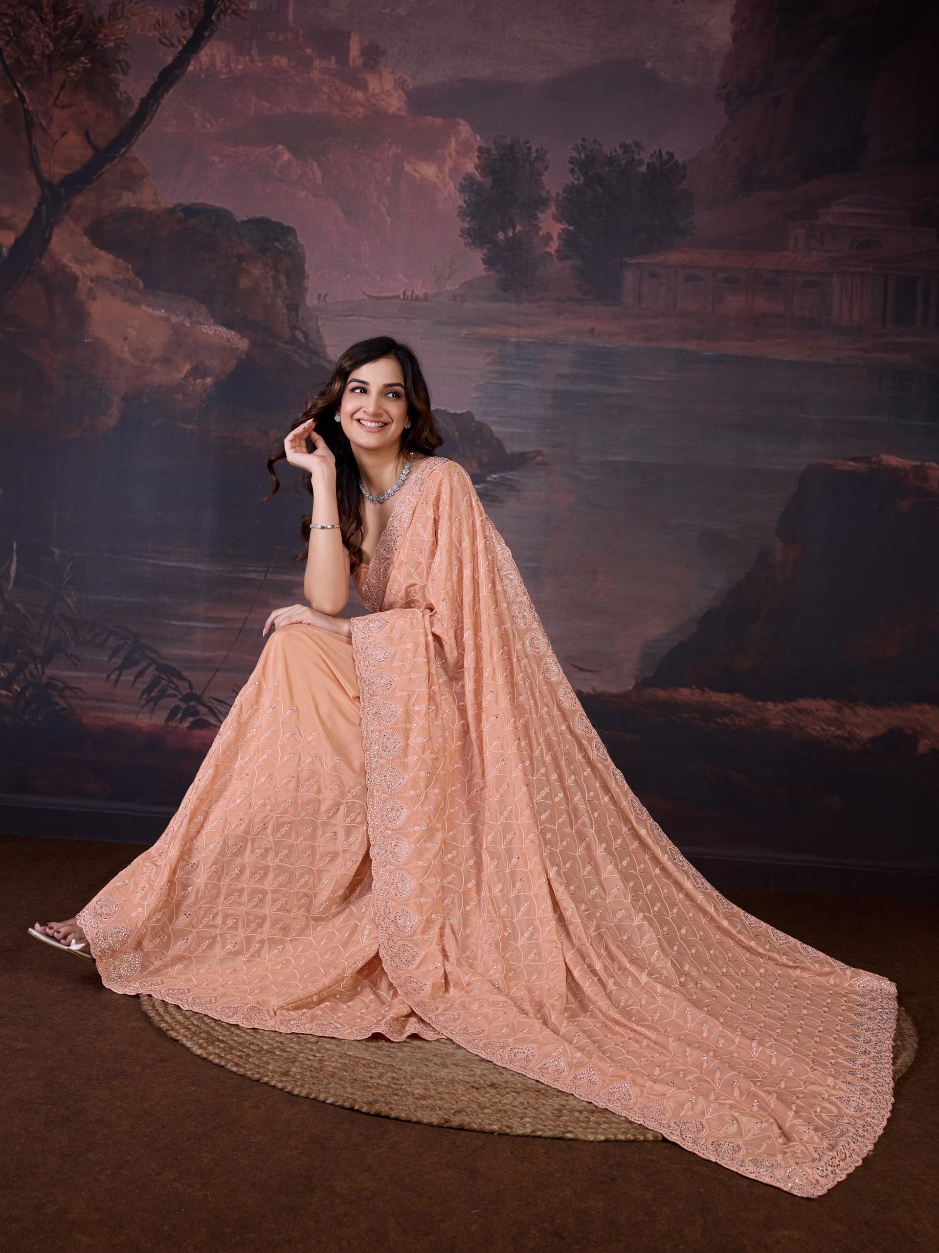 AKHILAM Women’s Heavy Georgette Sequence Work Saree With Unstitched Blouse Piece