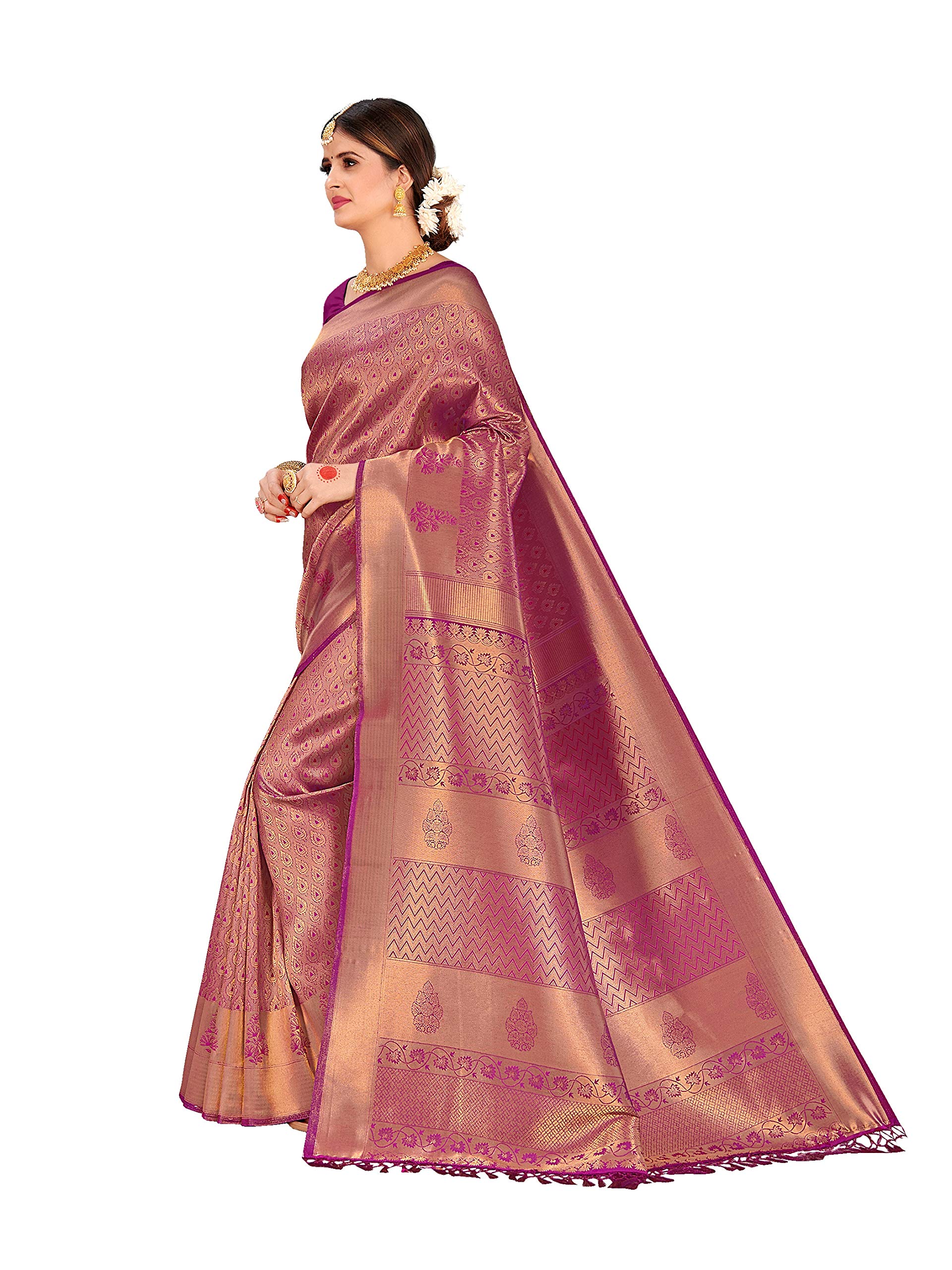 - PREMIUM QUALITY: This Woven Zari Design Saree is made from premium quality Kanchipuram raw silk material. It comes with an unstitched Brocade Blouse with Zari Border