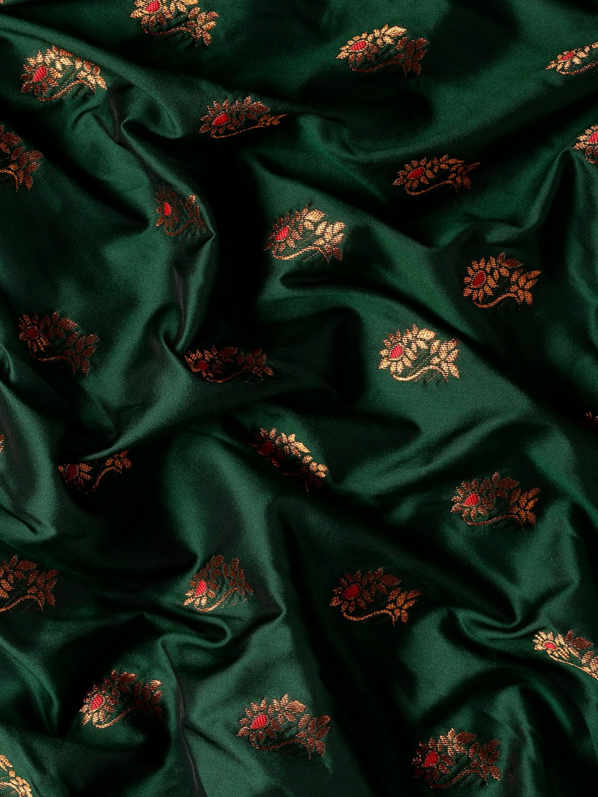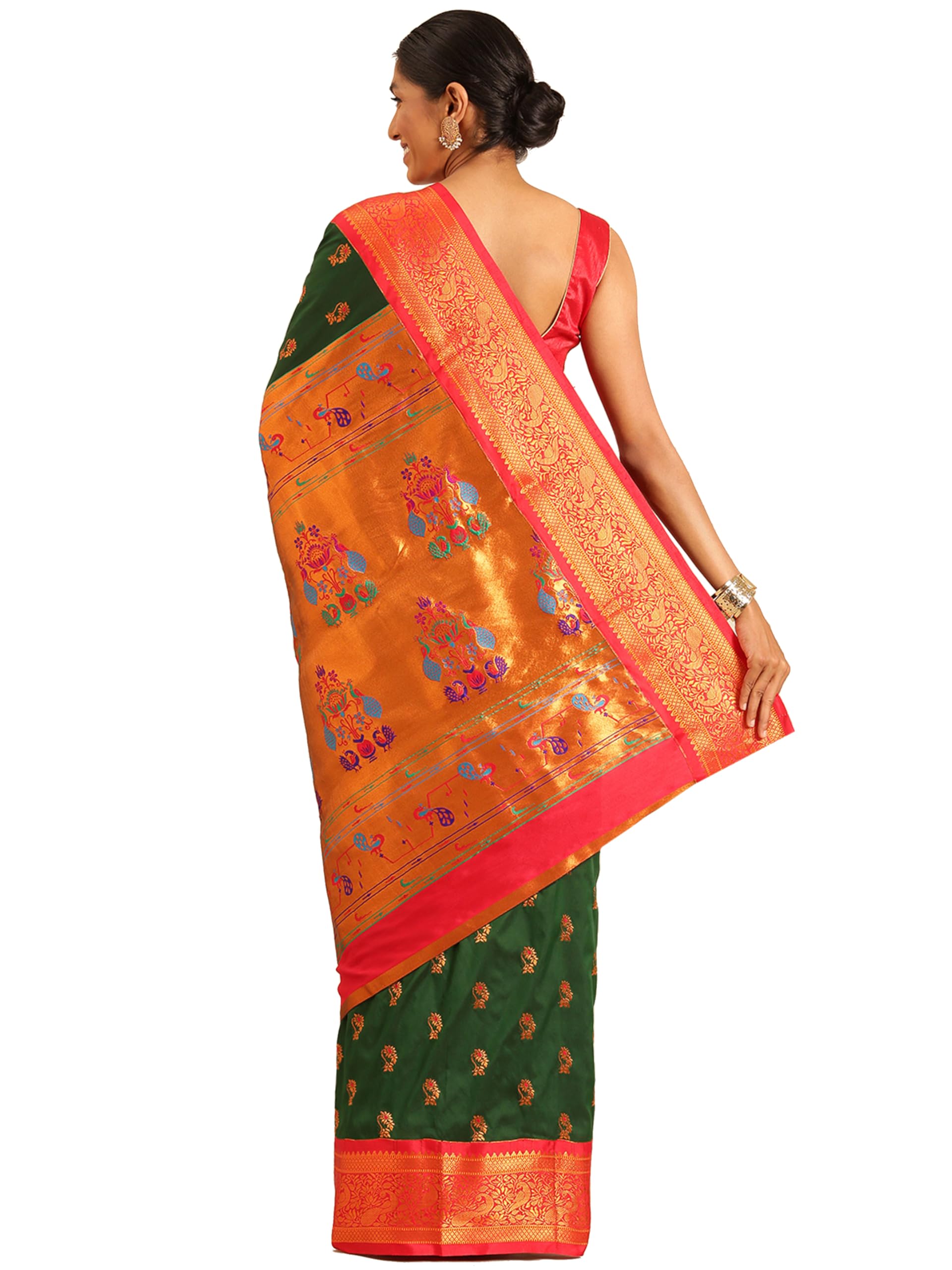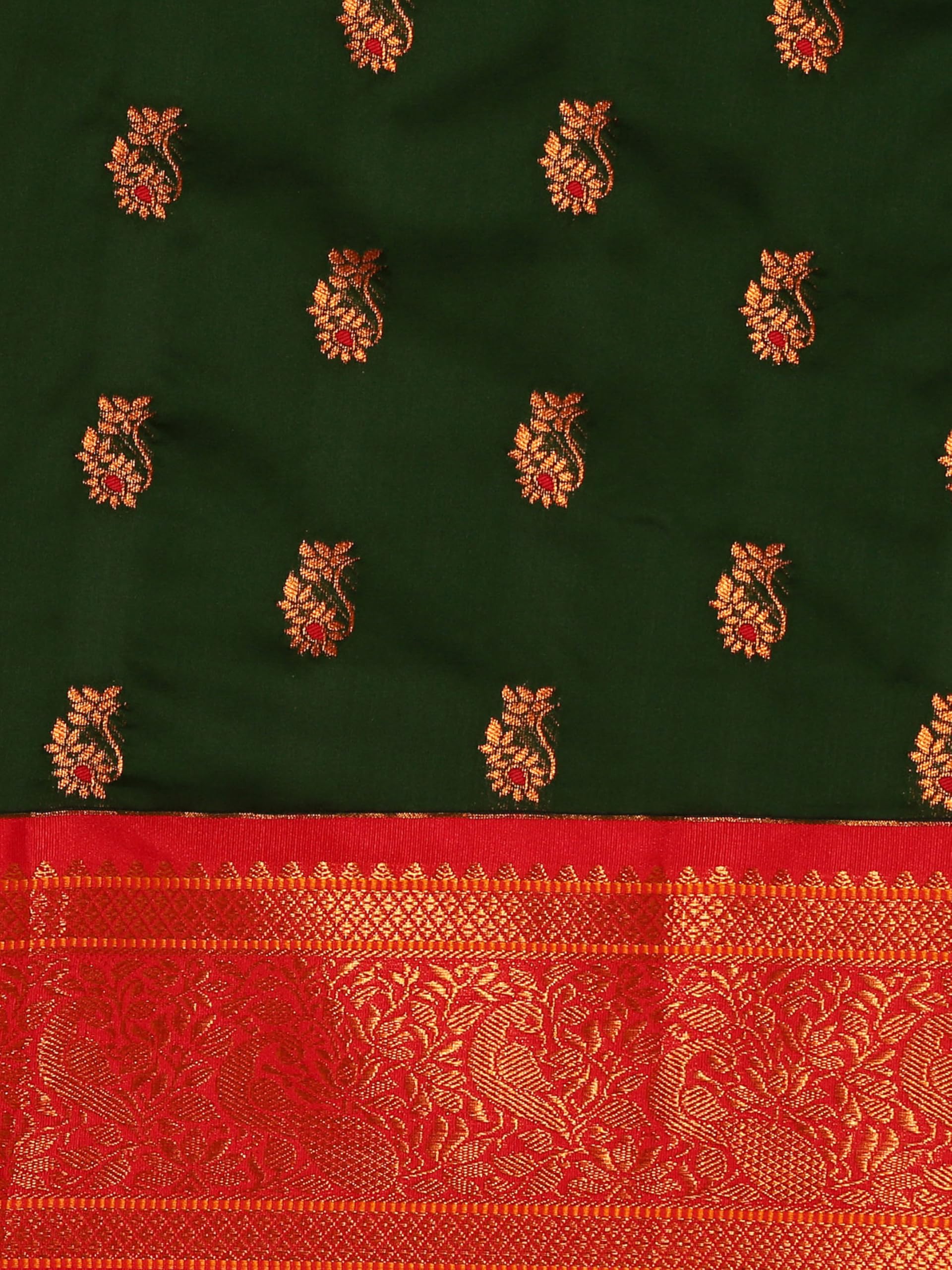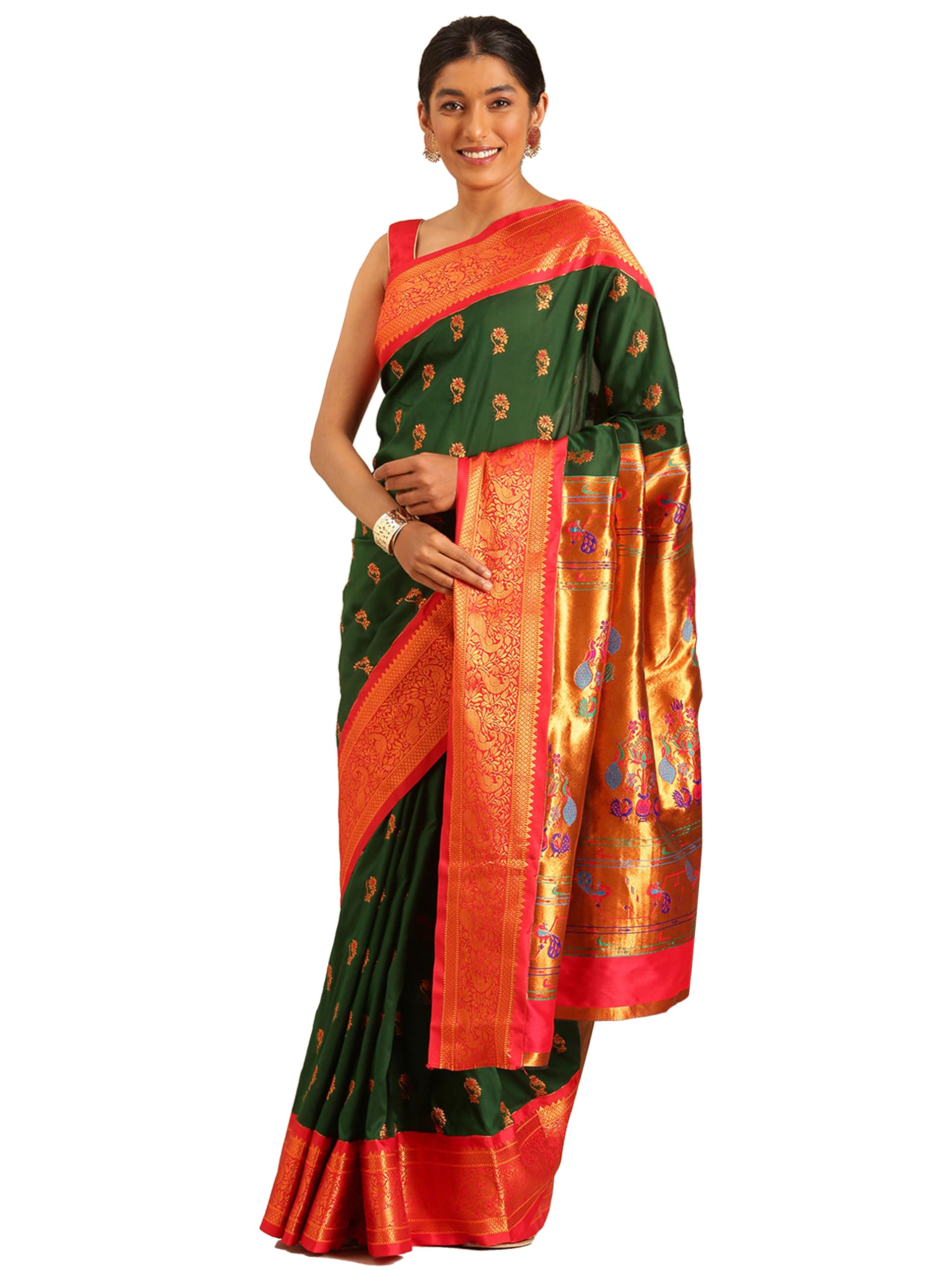 - Saree Details- Saree Color: Bottle Green & Red | Saree Material: 70% Polyester, 30% Silk | Saree Length: 5.5 Mtr | Saree Print: Woven | Saree Work Type: Copper Zari Peshwai Nath Meena Butti