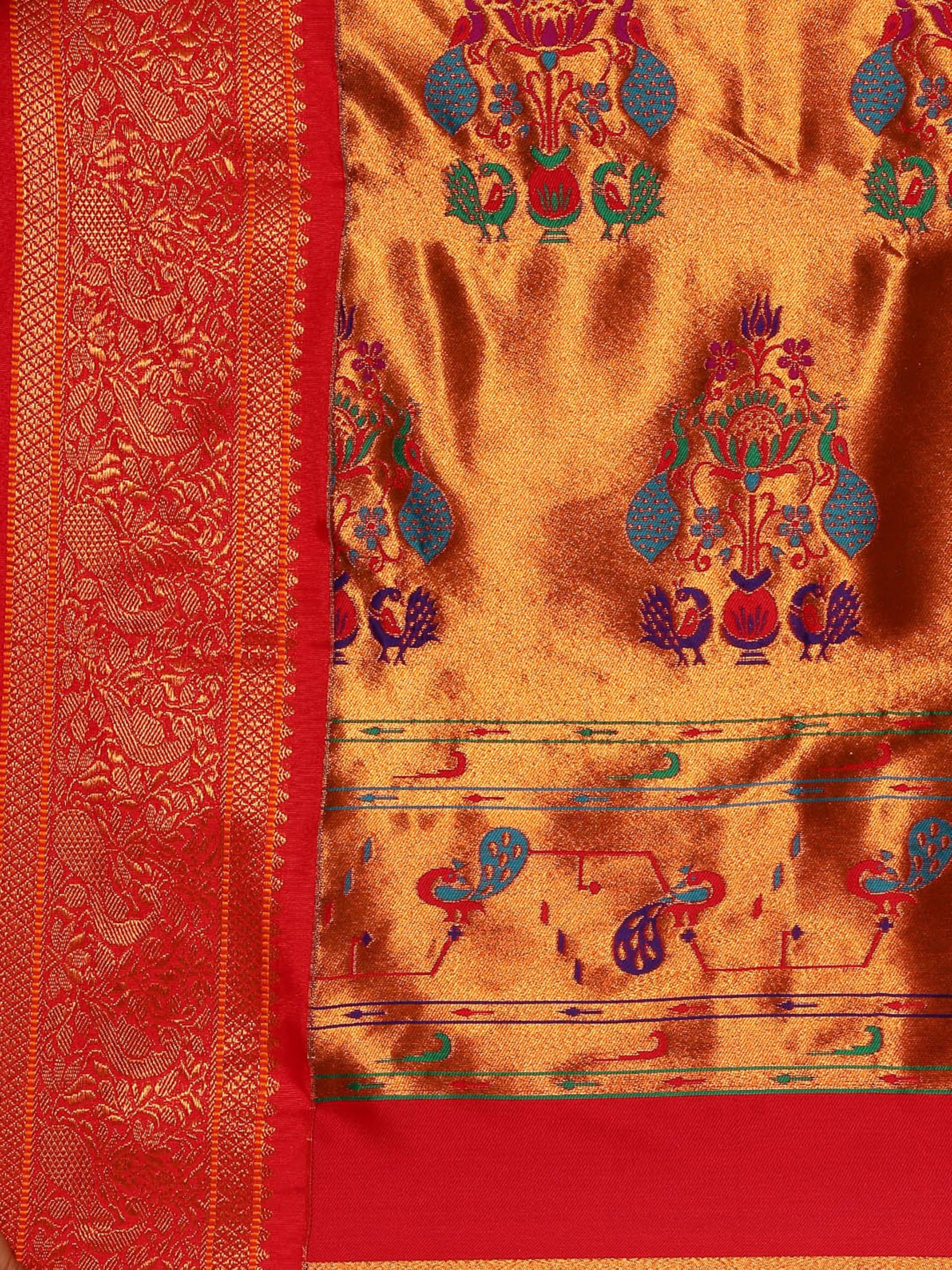 - Border & Pallu Details- Border Color: Red & Copper | Border Work Type: Intricate Checks Design Kadiyal Border | Pallu Color: Red & Copper | Pallu Work Type: Copper Zari Woven Peacock Motifs
