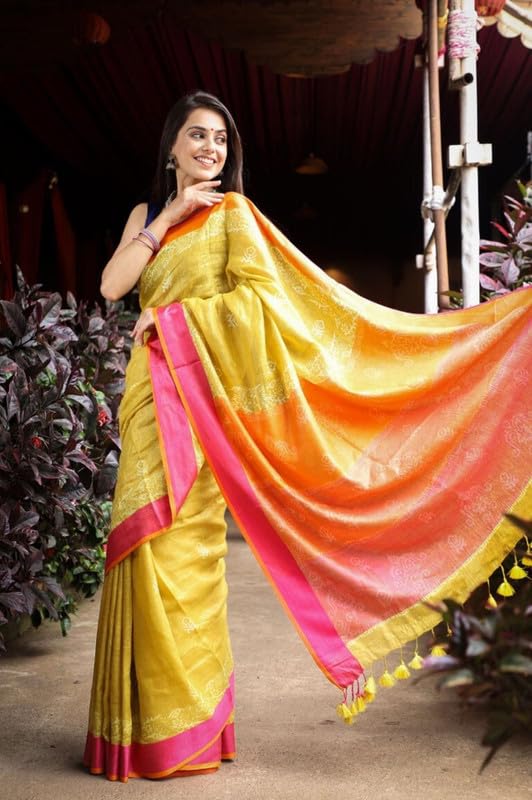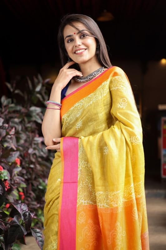 - Pure Linen Saree: Crafted from pure linen, our saree features a sleek border and an exclusive design that elevates your style. The summer yellow color and geometric patterns bring a perfect blend of elegance and modernity to your wardrobe.