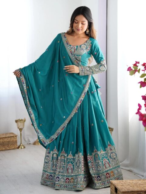 • Measurements: Lehenga(Semi-Stitched) Flair : 3.50mtr, waist-43″, height-43″; Blouse(Unstitched) Size: up to 44″; Dupatta Length: 2.25 mtr
