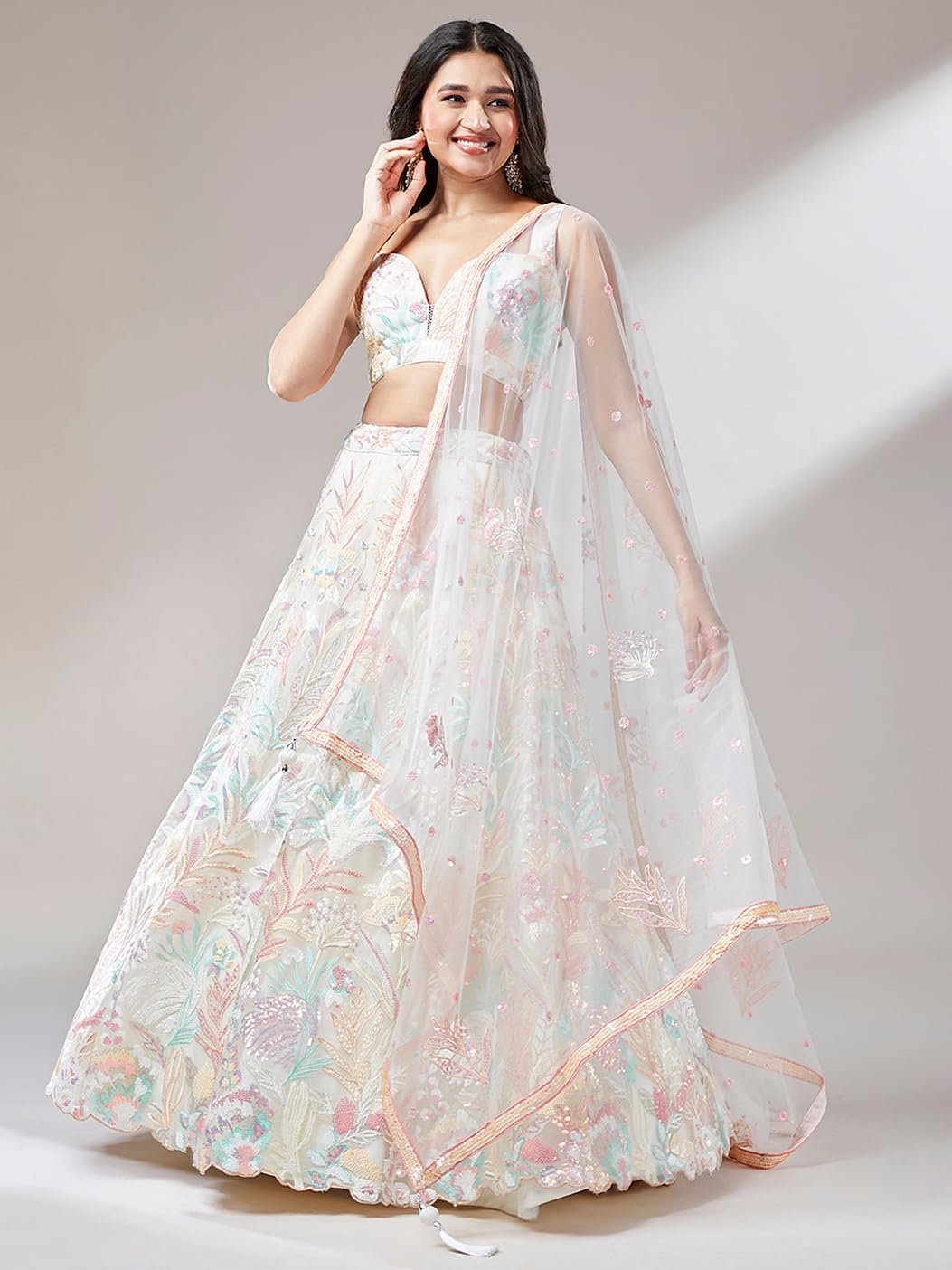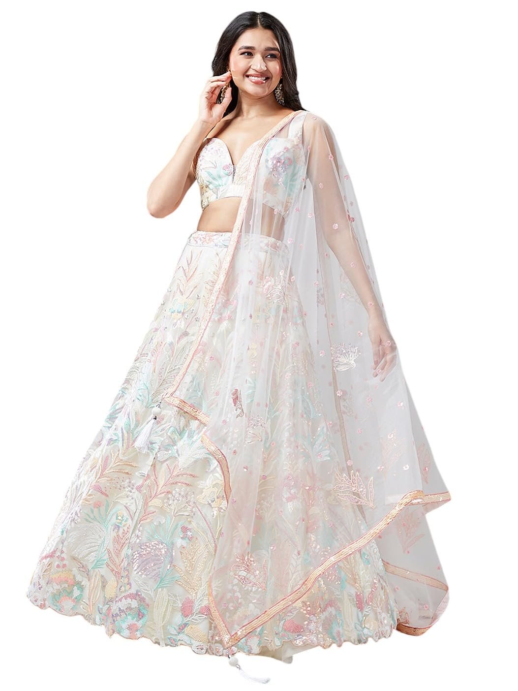Zeel Clothing Women's Sequins Embroidered Soft Net Readymade Lehenga Choli With Dupatta (6032-Off-White-Wedding-Stylish-Lehenga-Choli-Latest; Free Size)
